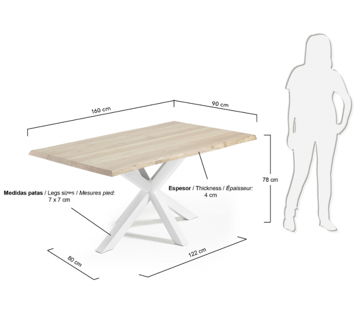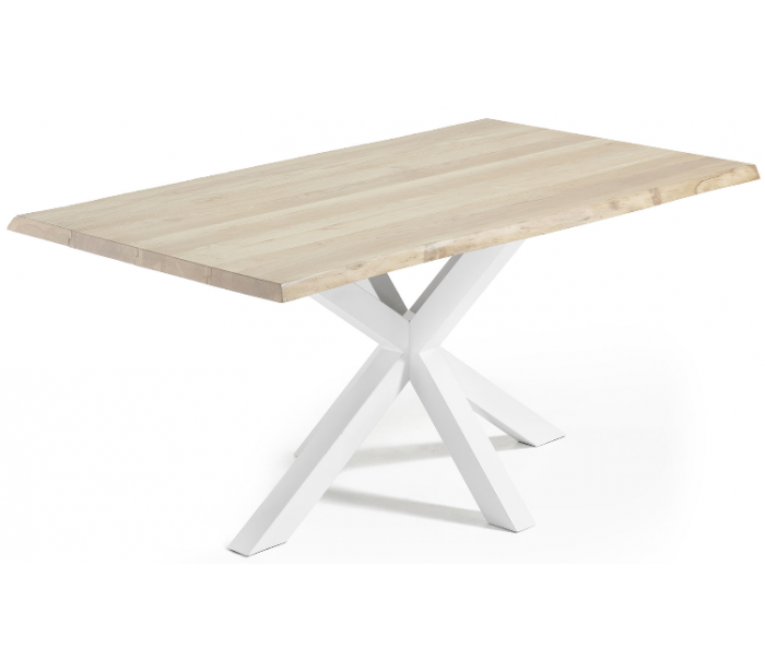 Spisebord i et design fra LaForma. Bordet er fremstillet med stel i hvidlakeret stål og med bordplade i massiv bleget egetræ med naturkant/bølget kant. Bordet måler 78 cm i højden og 160 x 90 cm i bredde og dybde.