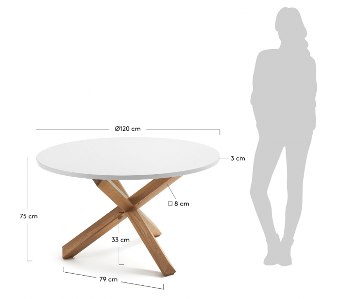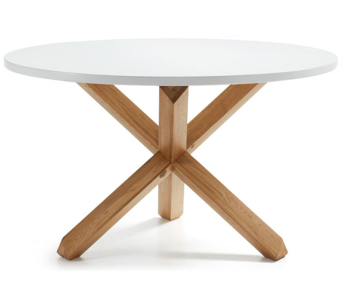 Rundt spisebord i et design fra LaForma. Bordet er fremstillet i hvidfolieret mdf og massiv egetræ. Bordet måler 75 cm i højden og 120 cm i diameter.