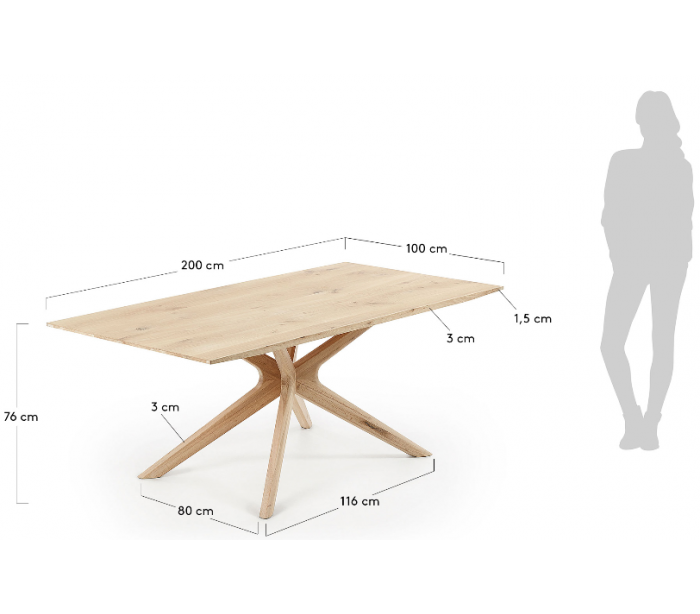 Spisebord i et design fra LaForma. Bordet er fremstillet i massiv egetræ og måler 76 cm i højden og 200 x 100 cm i bredde og dybde.