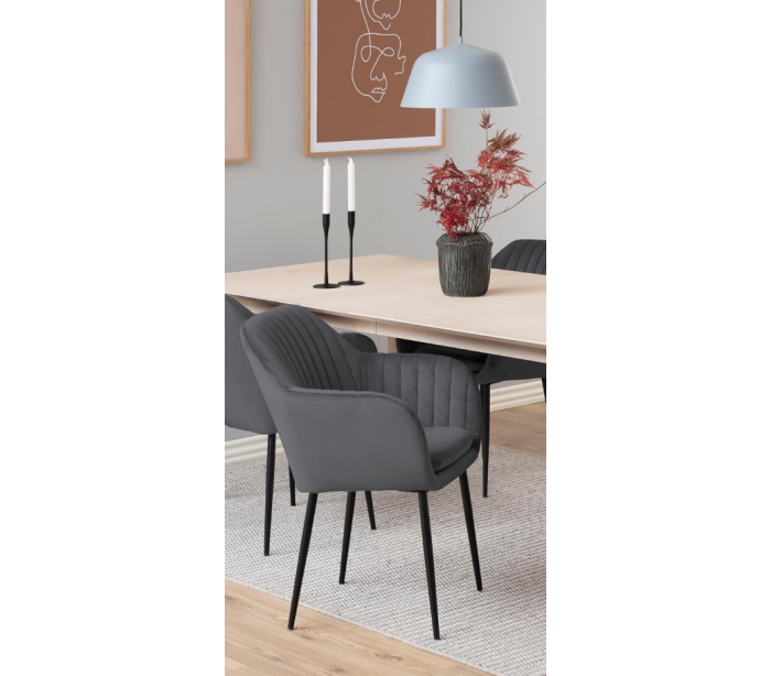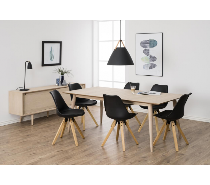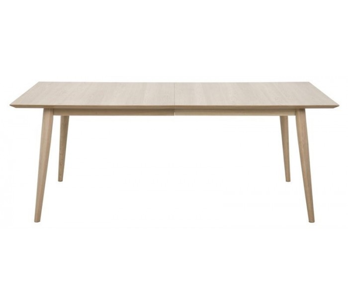 Spisebord udført i et design af egetræ og egetræsfinér. Spisebordet måler 200 cm i bredden og 100 cm i dybden og er forberedt til tillægsplader (tilkøb).