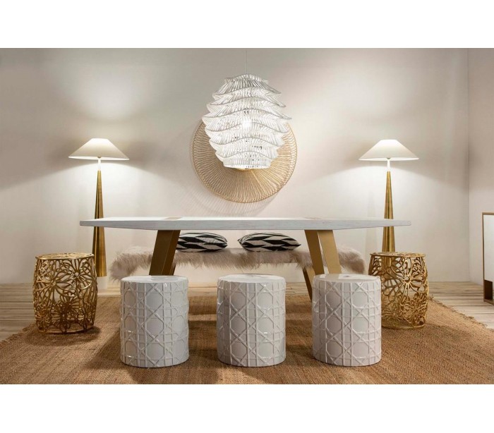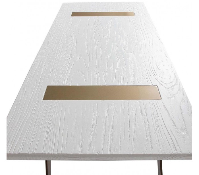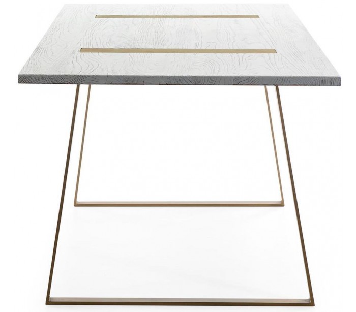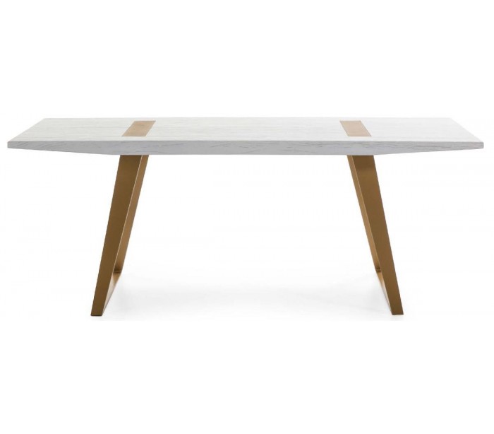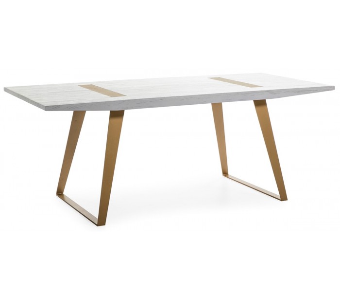 Spisebord udført i et let moderne, men rustikt design i antik guldfarvet metal og antik hvidbejset træ. Spisebordet måler 200 cm i bredden og 90 cm i dybden.