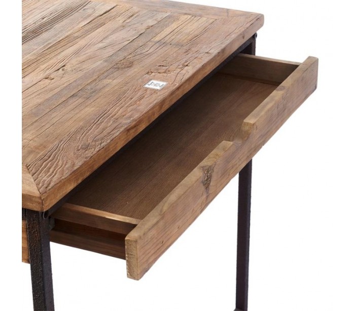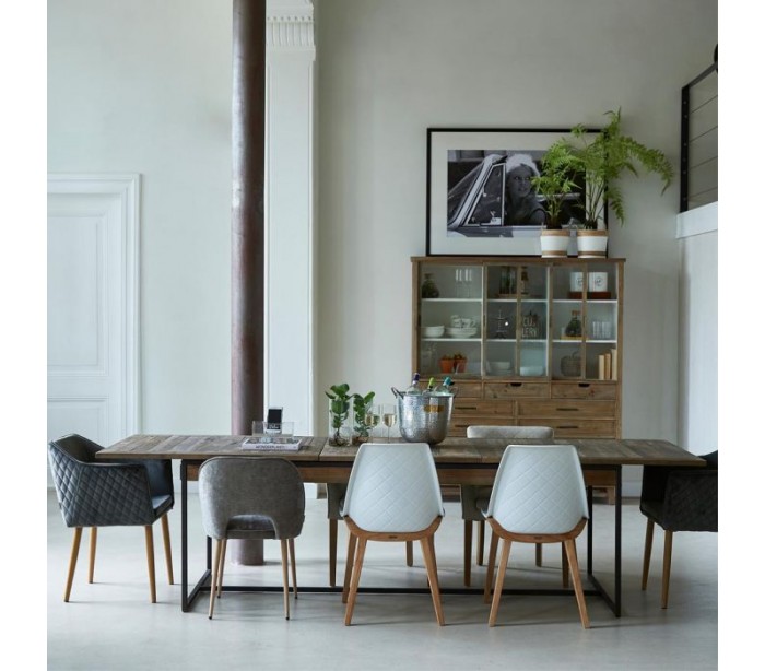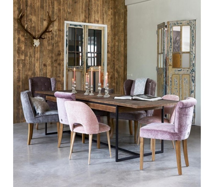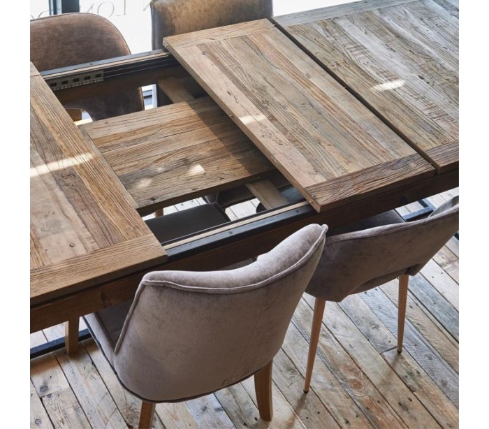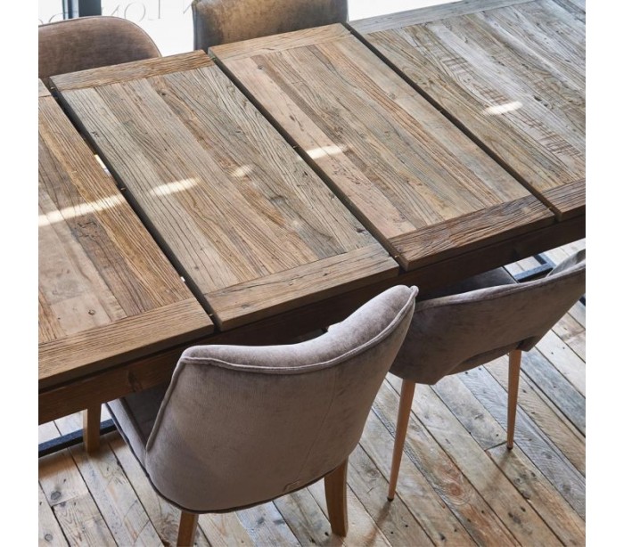 Spisebord fra Riviera Maison, udført i et rustikt design af massiv genanvendt elmetræ og industrielt sortlakeret jern. Spisebordet kommer med 1 skuffe forlængerplader og måler 78 cm i højden og 220/300 cm i bredde og 90 cm i dybde.