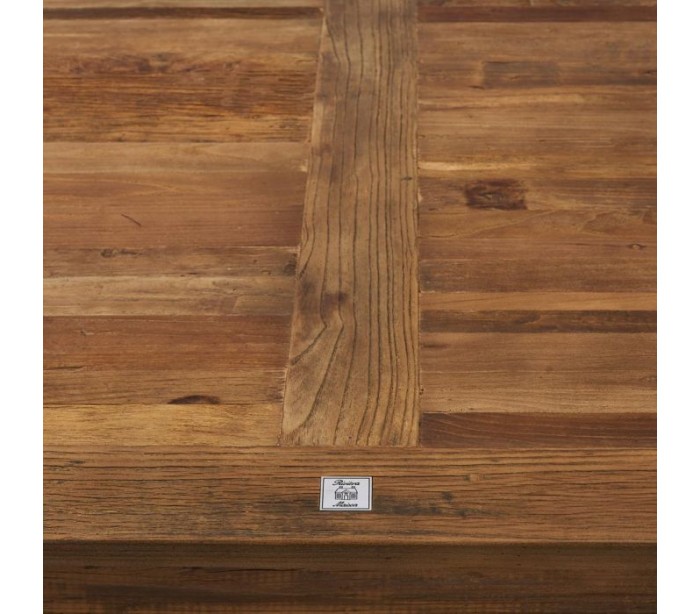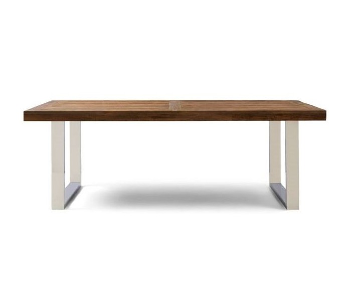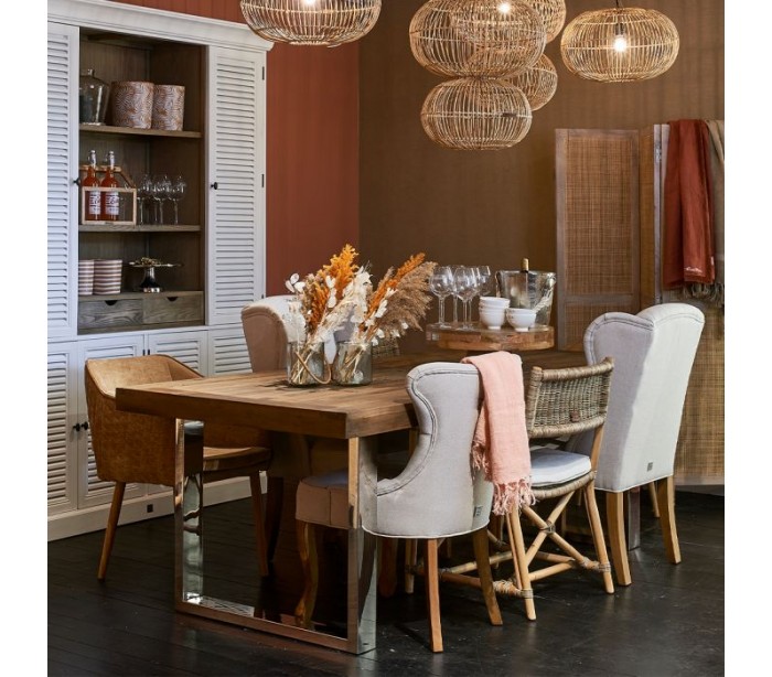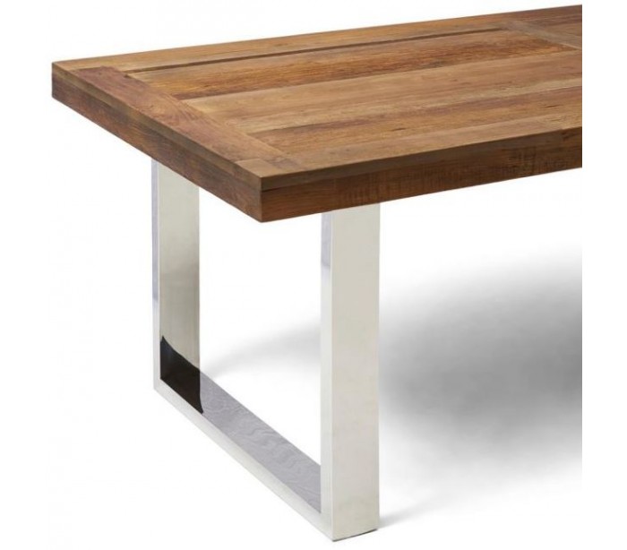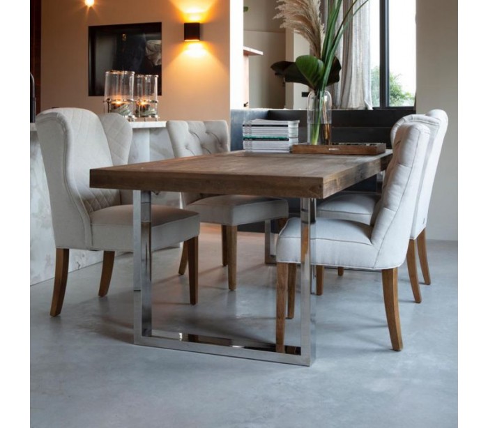 Spisebord fra Riviera Maison, udført i et moderne design af massiv genanvendt elmetræ og rustfri stål. Spisebordet måler 79 cm i højden og 230 cm i bredde og 100 cm i dybde.