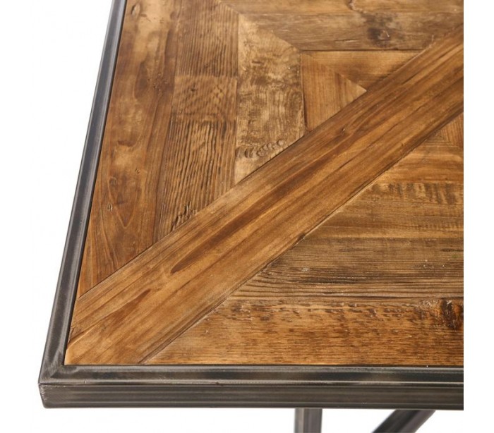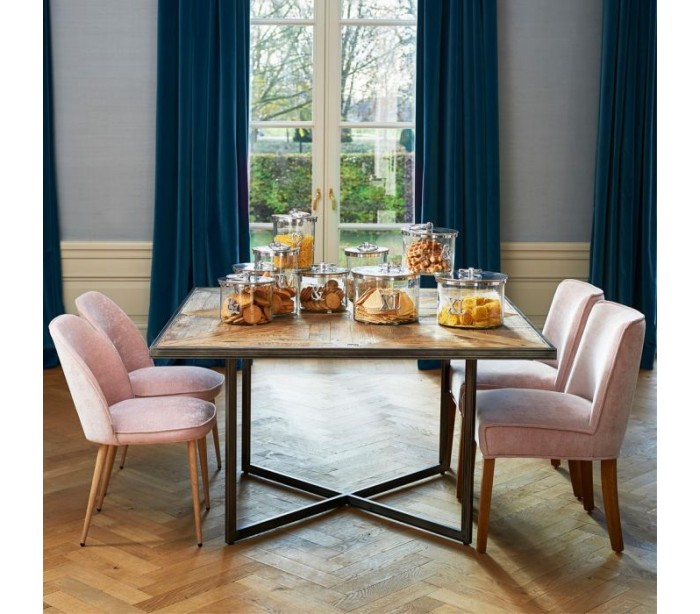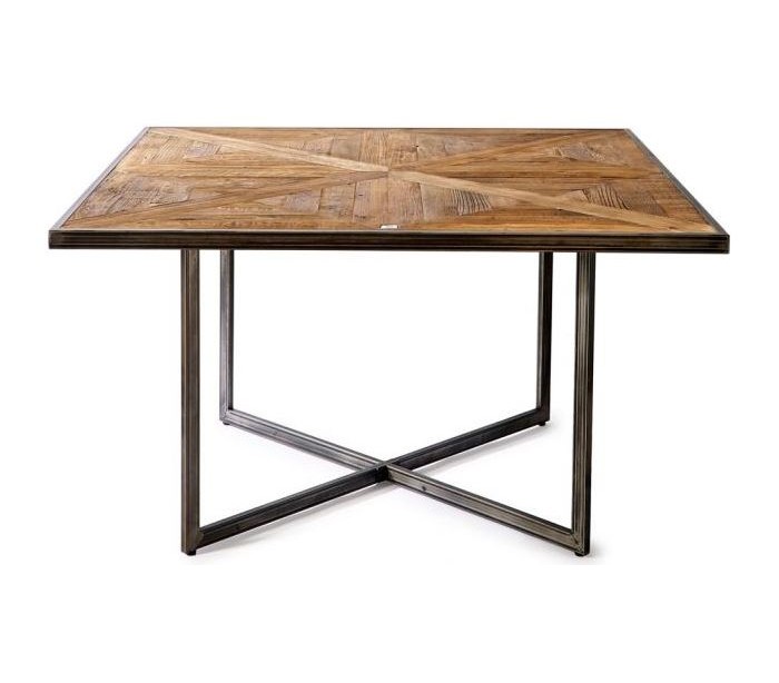 Spisebord fra Riviera Maison, udført i et rustikt design af massiv genanvendt egetræ og industrielt jern. Spisebordet måler 78 cm i højden og 140 x 140 cm i bredde og dybde.