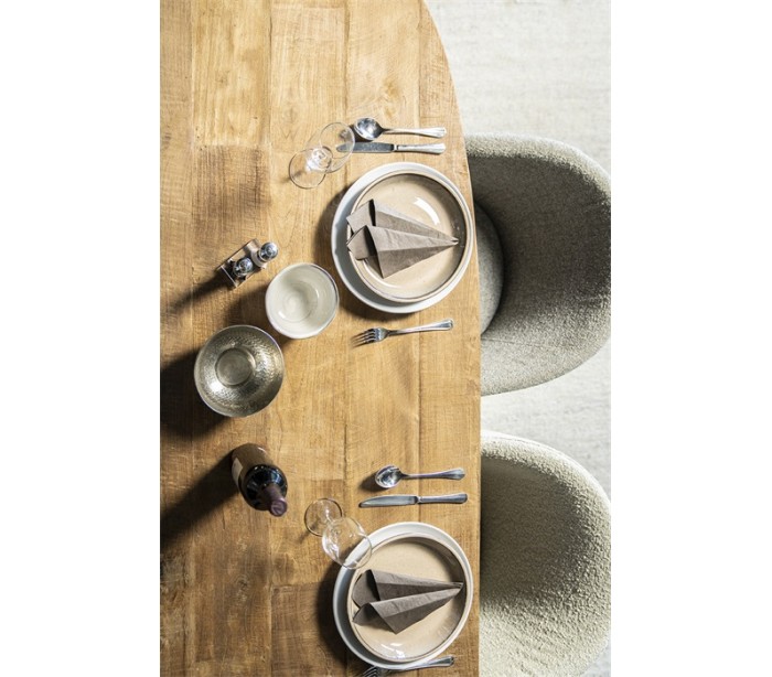 Spisebord fremstillet i et design af lakeret genanvendt teaktræ. Bordet måler 78 cm i højden og 260 x 100 cm i bredde og dybde. Afstanden mellem benene er 70 cm og 214 cm.