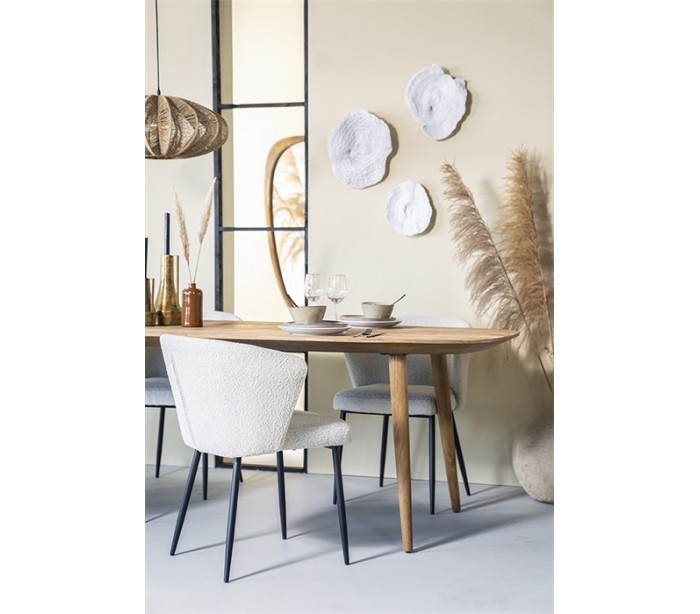 Spisebord fremstillet i et design af lakeret genanvendt teaktræ. Bordet måler 78 cm i højden og 300 x 100 cm i bredde og dybde. Afstanden mellem benene er 70 cm og 254 cm.