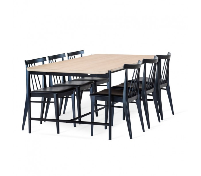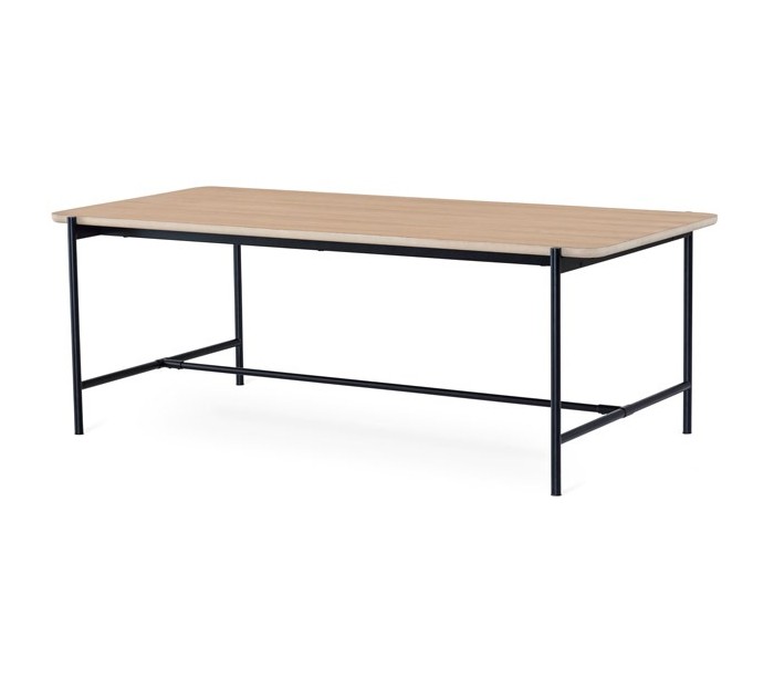 Spisebord i et moderne design, fremstillet med stel i sortlakeret metal og bordplade i hvidolieret egetræsfinér. Bordet måler 210 x 100 cm i bredde og dybde og 75 cm i højden.