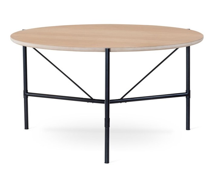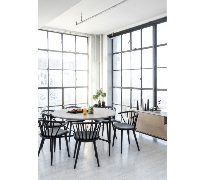 Spisebord i et moderne design, fremstillet med stel i sortlakeret metal og bordplade i hvidolieret egetræsfinér. Bordet måler 135 cm i diameter og 75 cm i højden.