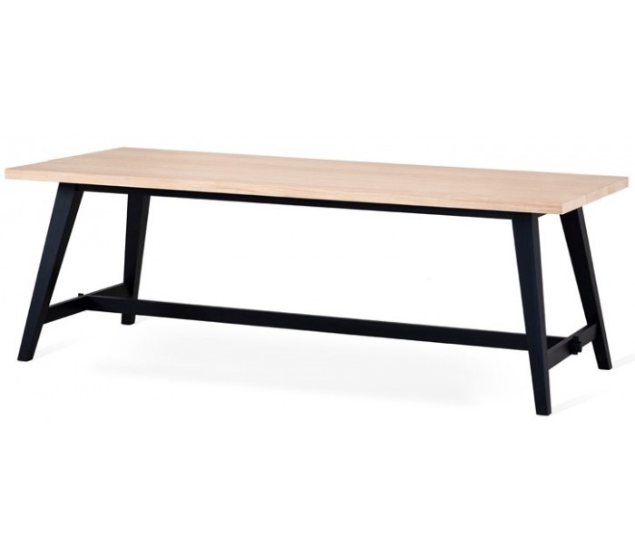 Spisebord i et moderne design, fremstillet med stel i sortlakeret træ og bordplade i hvidolieret egetræsfinér. Bordet måler 220 x 95 cm i bredde og dybde og 75 cm i højden.