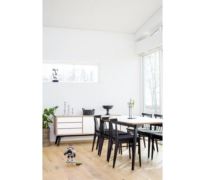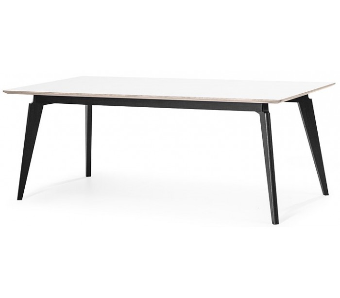 Spisebord i et moderne design, fremstillet med stel i sortlakeret træ og bordplade i hvid højtrykslaminat med natur kant. Bordet måler 200 x 95 cm i bredde og dybde og 75 cm i højden.