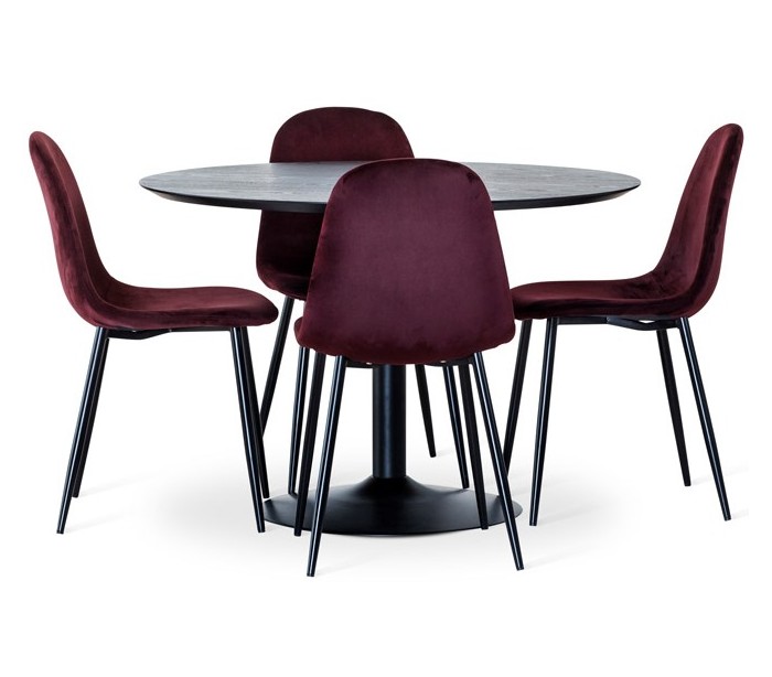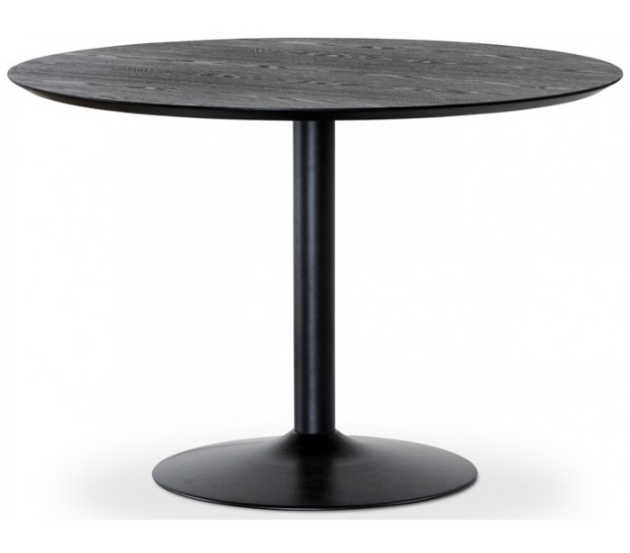 Spisebord i et moderne design, fremstillet med bordplade i sortlakeret ask træ og stel i sortlakeret metal. Bordet måler 110 cm i diameter og 75 cm i højden.