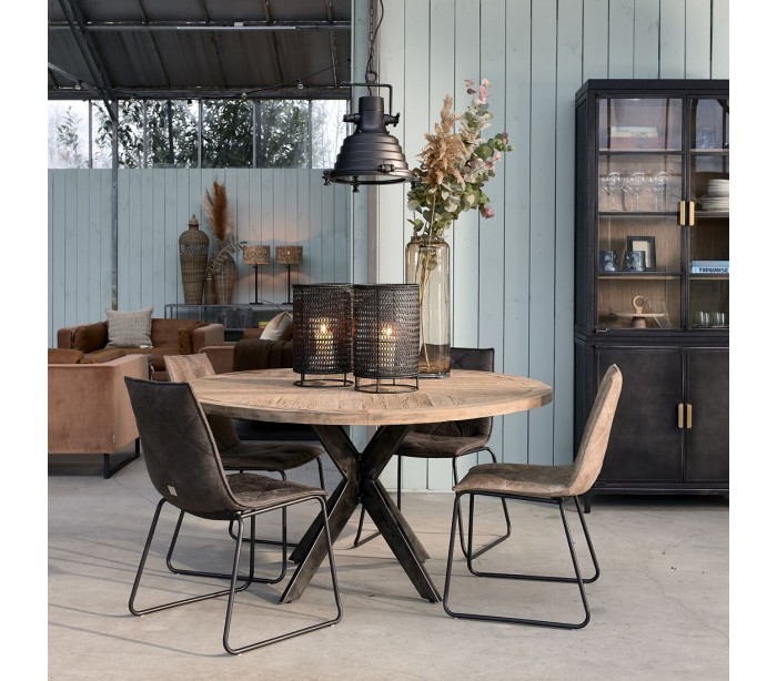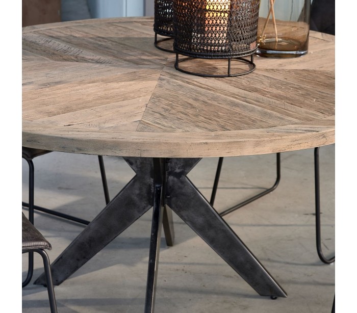 Rundt spisebord fra Riviera Maison, udført i et rustikt design af massiv genanvendt egetræ og med stel i industrielt lakeret jern. Spisebordet måler 78 cm i højden og 150 cm i diameter.