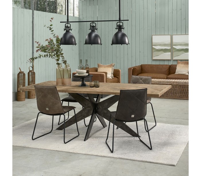 Spisebord fra Riviera Maison, udført i et rustikt design af massiv genanvendt egetræ og med stel i industrielt lakeret jern. Spisebordet måler 78 cm i højden og 230 x 100 cm i bredde og dybde.