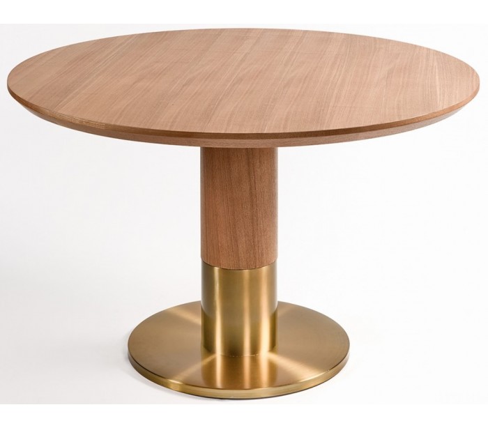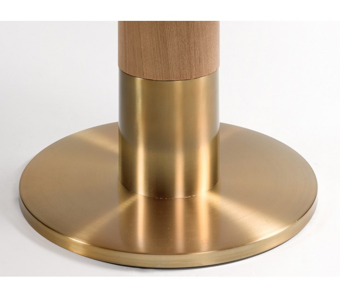 Rundt spisebord udført i et moderne design i ask træ og guldfarvet metal. Spisebordet måler 120 cm i diameter og 76 cm i højden.