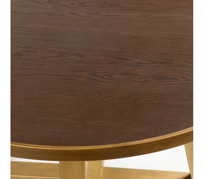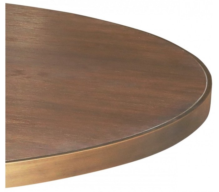 Rundt spisebord udført i et design i antik guldfarvet metal og rustikt brunbejset egetræ. Spisebordet måler 150 cm i diameter og 76 cm i højden.