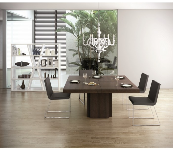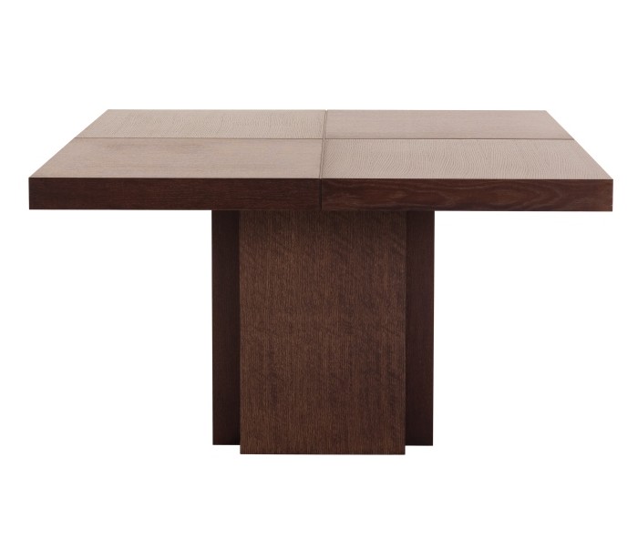 TemaHome Dusk spisebord udført i et design af chokoladefarvet melamin og finér. Spisebordet måler 75 cm i højden og 150 x 150 cm i bredde og dybde.