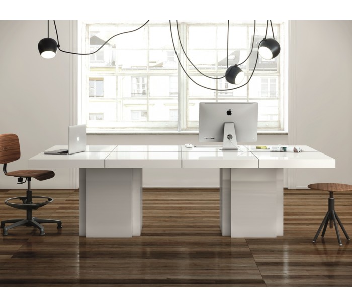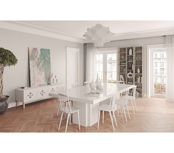 TemaHome Dusk spisebord udført i et design af hvid højglans lakeret finér og melamin. Spisebordet måler 75 cm i højden og 262 x 130 cm i bredde og dybde.
