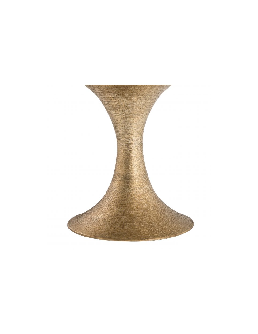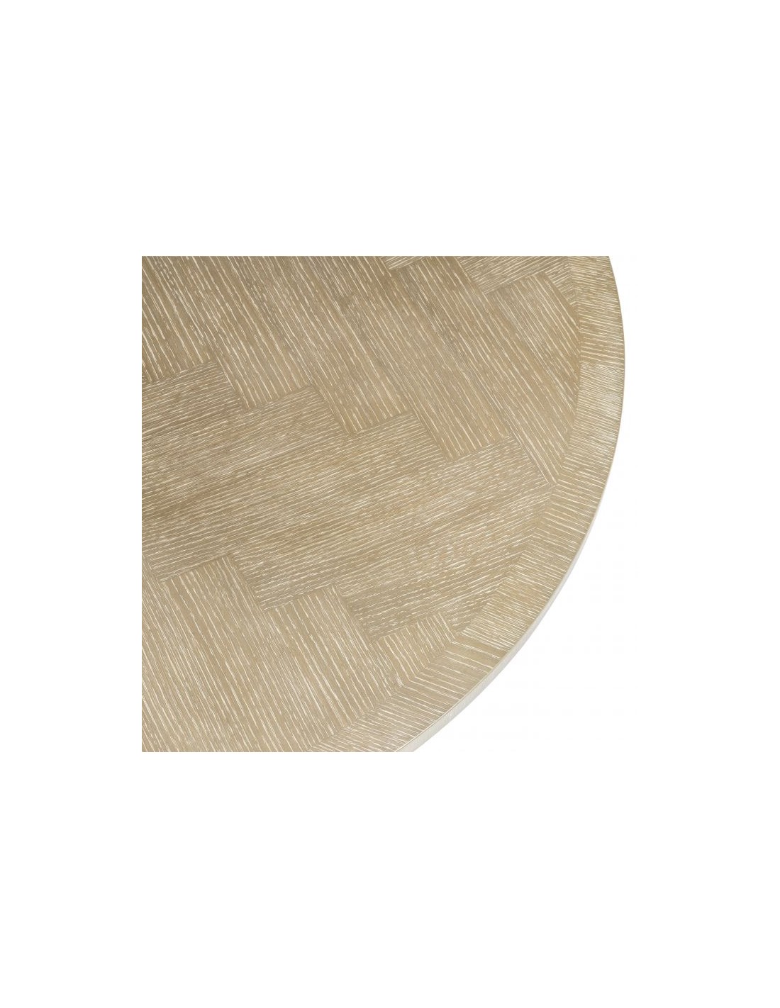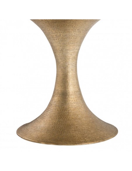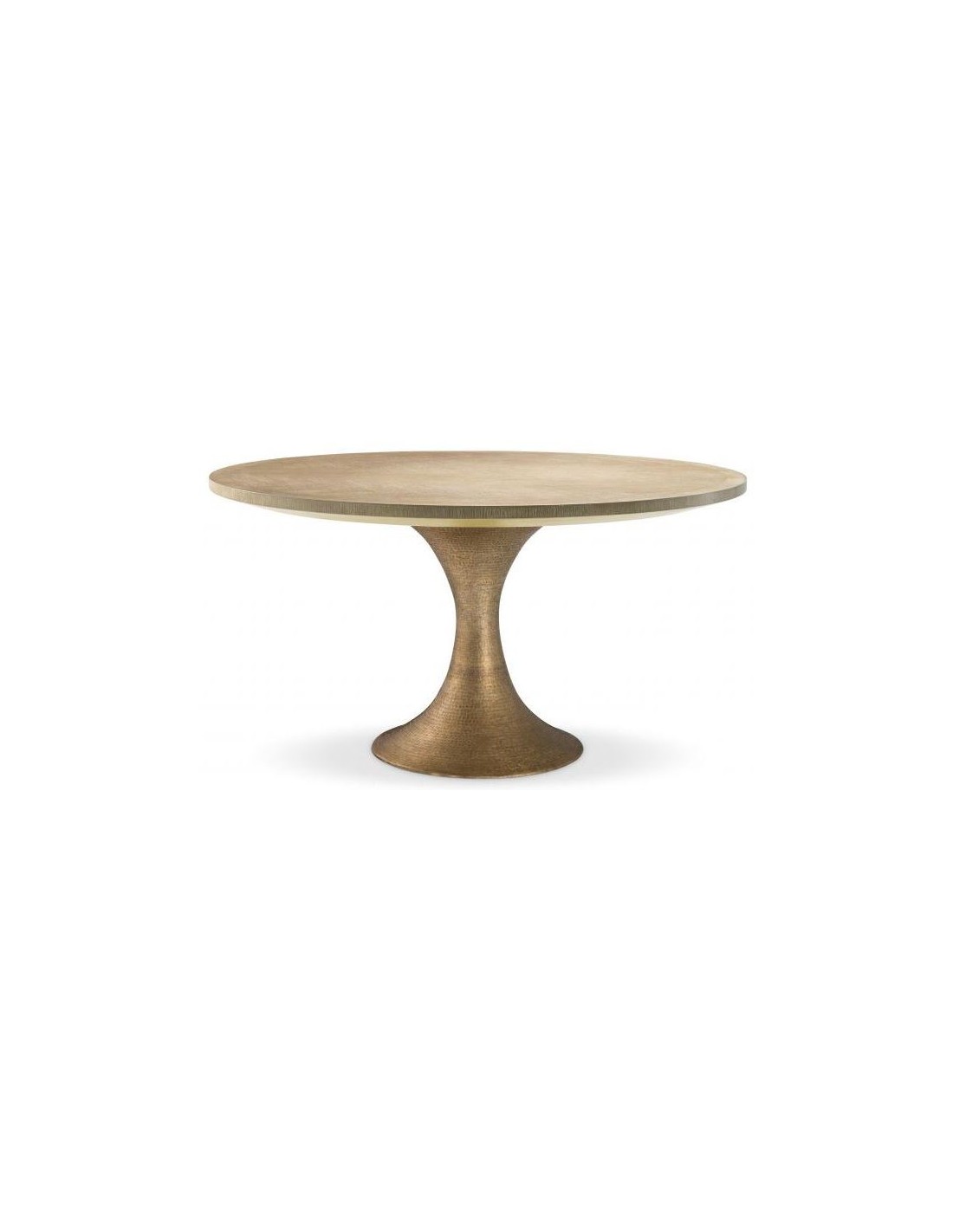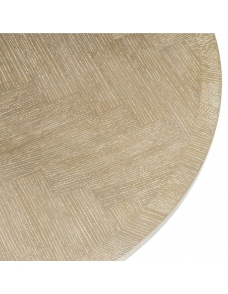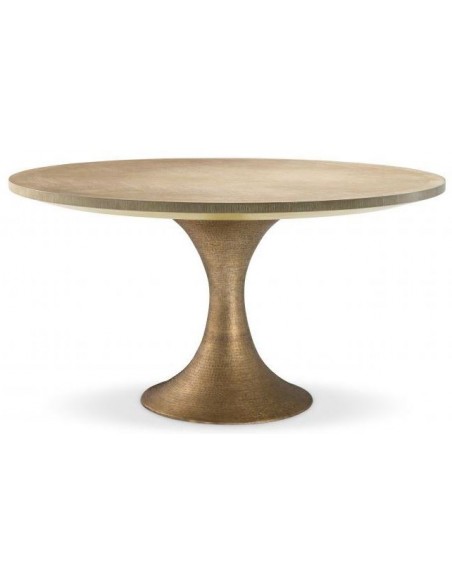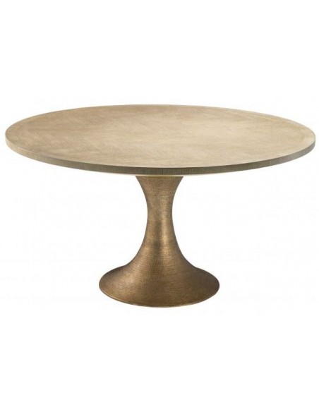 Eichholtz Melchior spisebord i et moderne udført design af antik messinglakeret jern og vasket egetræsfinér. Spisebordet måler 76 cm i højden og 140 cm i diameter.