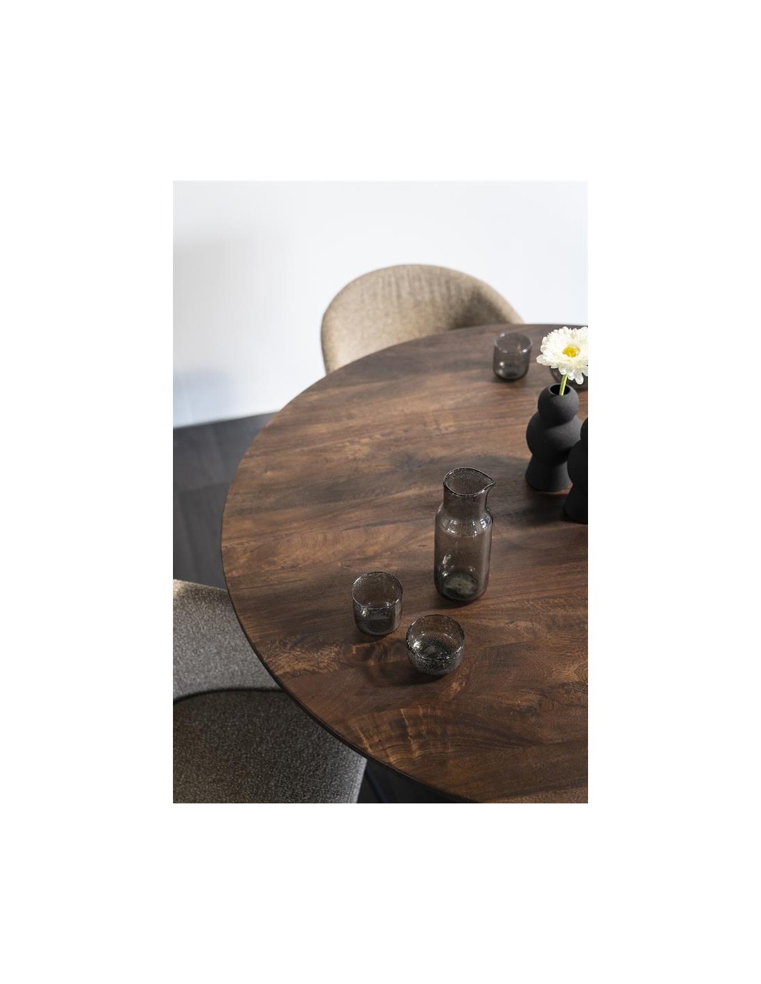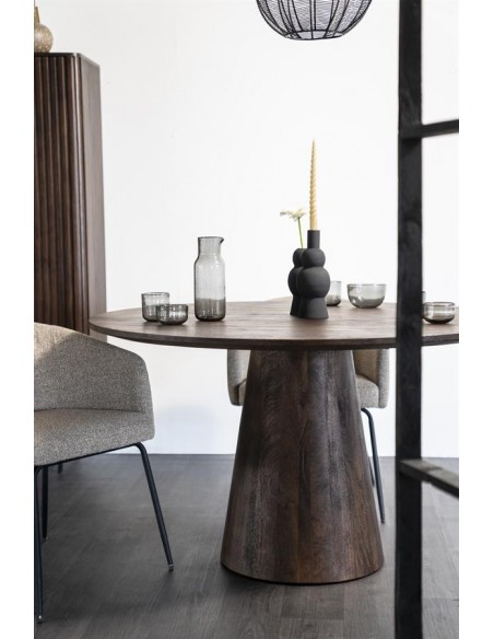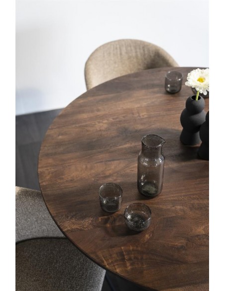 Aron spisebord udført i et moderne design, fremstillet i brunbejset genanvendt mangotræ. Spisebordet måler 76 cm i højden og 130 cm i diameter.