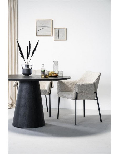 Aron spisebord udført i et moderne design, fremstillet i sortlakeret genanvendt mangotræ. Spisebordet måler 76 cm i højden og 130 cm i diameter.