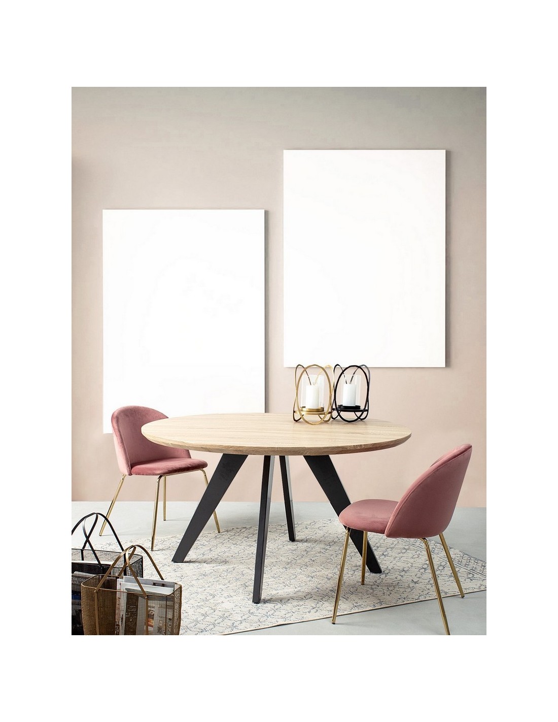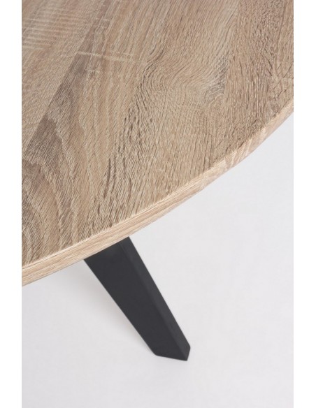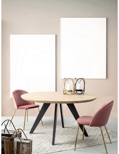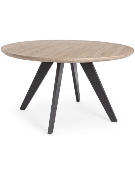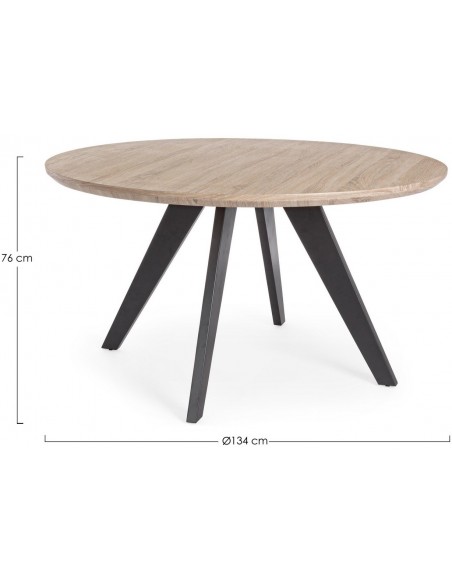 Rundt spisebord udført i et design af sortlakeret stål og med bordplade i naturfarvet mdf finér. Spisebordet måler 76 cm i højden og 134 cm i diameter.