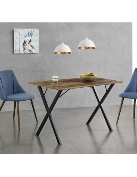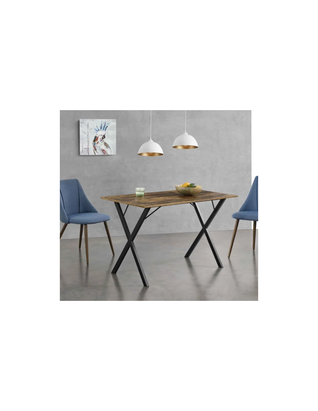 Spisebord udført i et design af metal og møbelplade. Spisebordet måler 75 cm i højden og 120 x 60 cm i bredde og dybde.