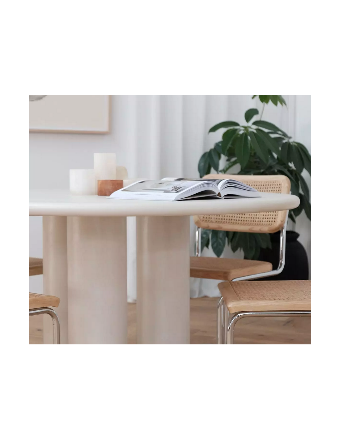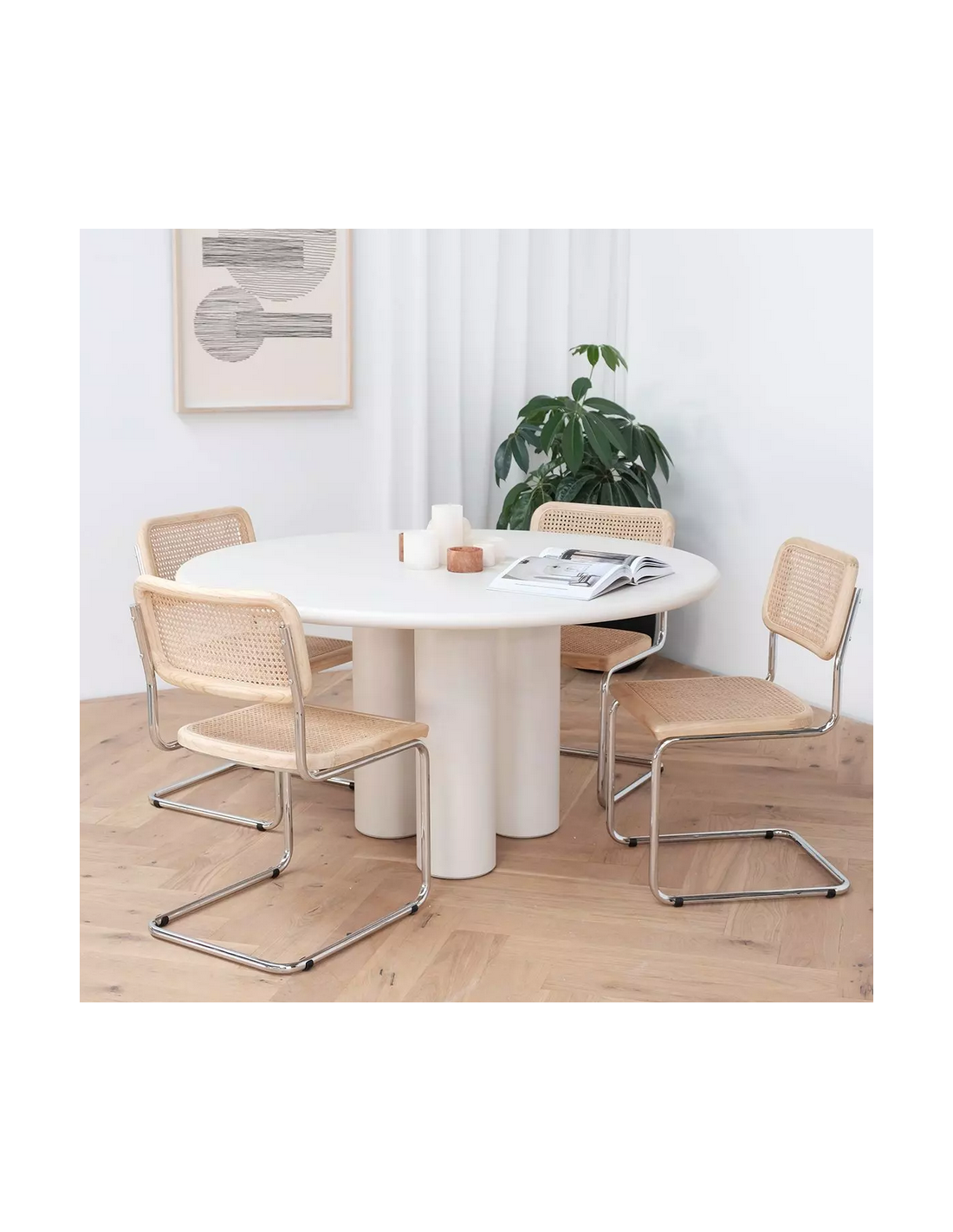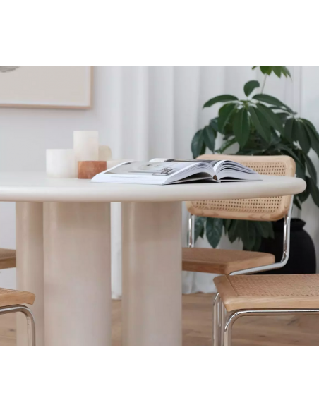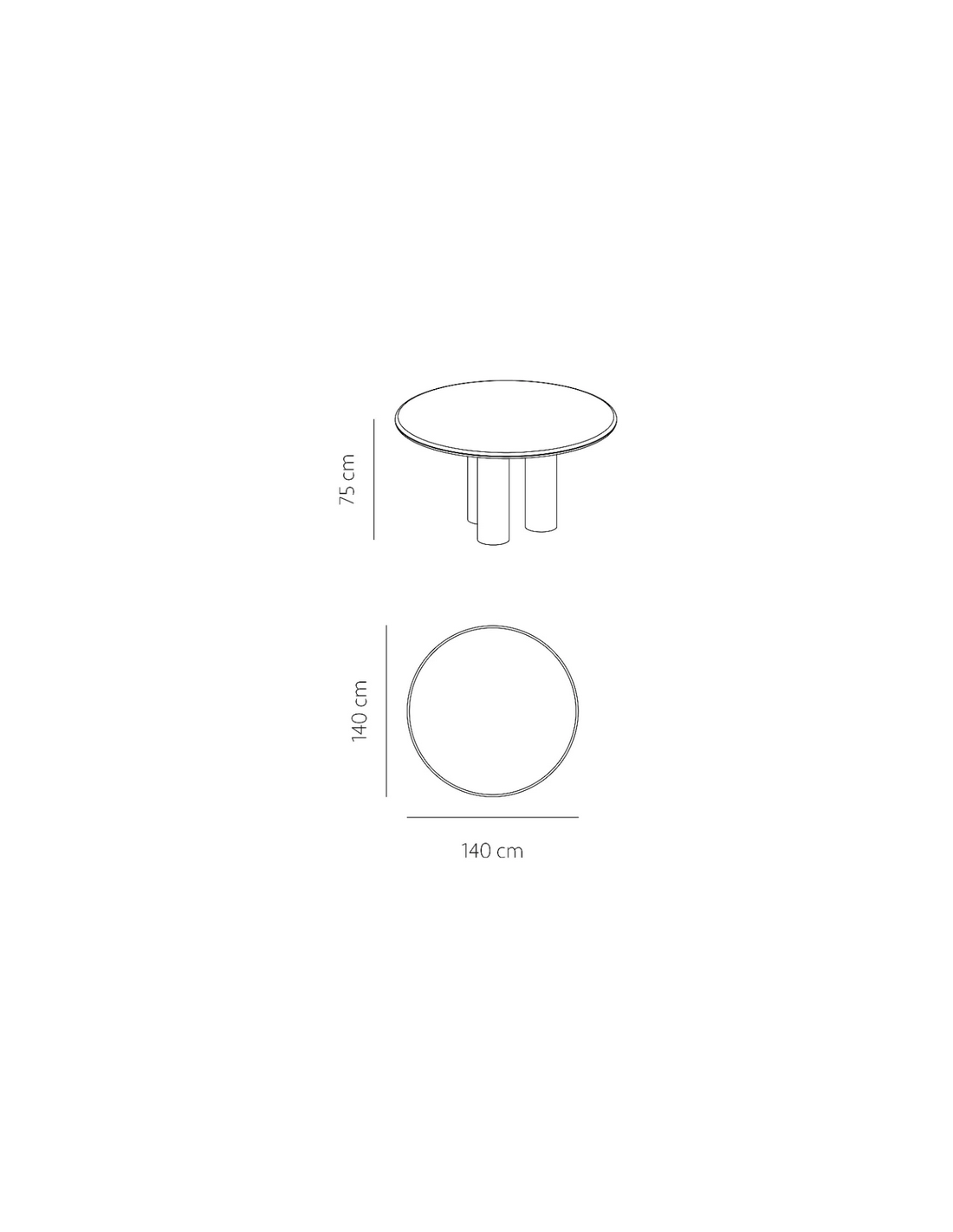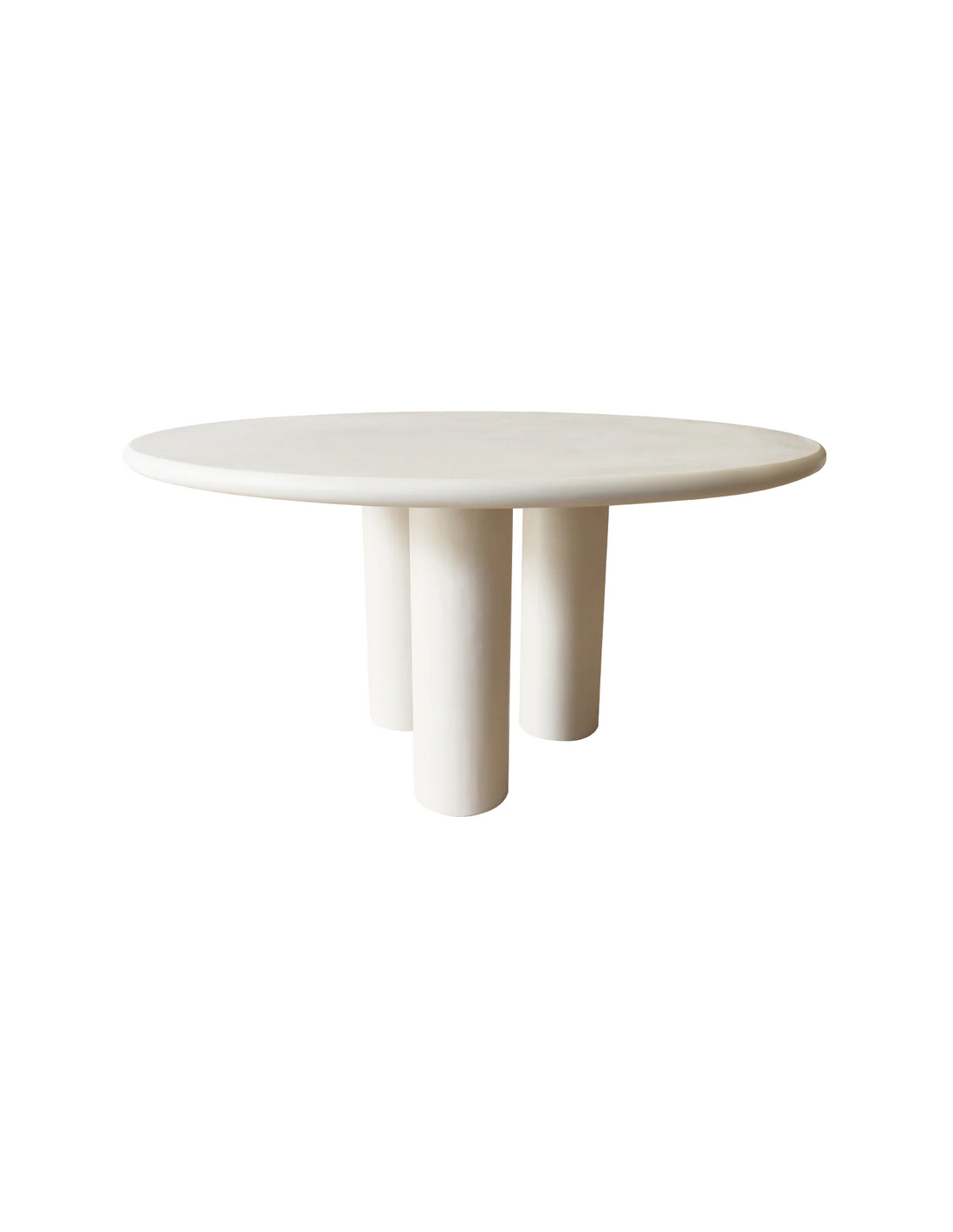 Rundt spisebord udført i et moderne design af råhvid mortex. Spisebordet måler 75 cm i højden og 140 cm i diameter. Mortex er en blanding af mineraler og beton, der gør det muligt at fremstille et bord med organiske former, samtidig med at overfladen er gjort vandafvisende.