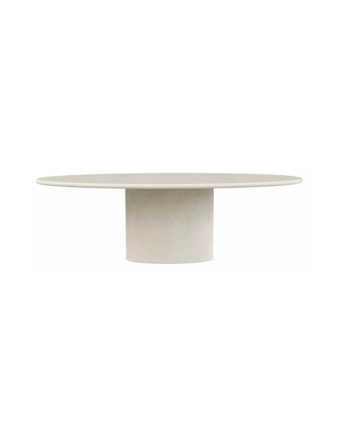 Ovalt spisebord udført i et moderne design af sandfarvet mortex. Spisebordet måler 76 cm i højden og 240 x 120 cm i bredde og dybde. Mortex er en blanding af mineraler og beton, der gør det muligt at fremstille et bord med organiske former, samtidig med at overfladen er gjort vandafvisende.