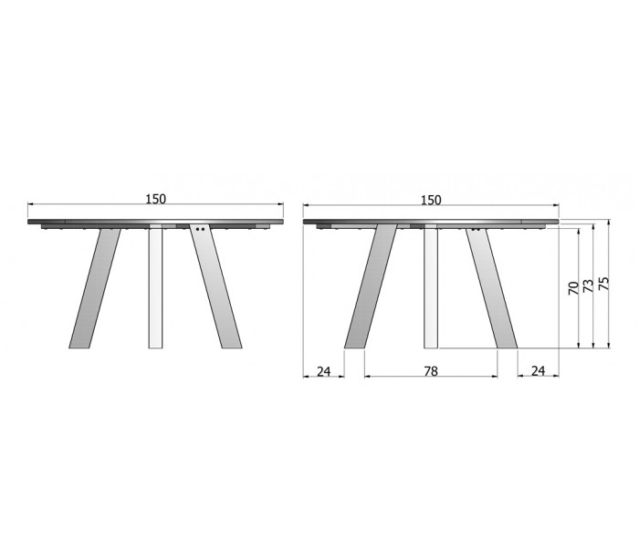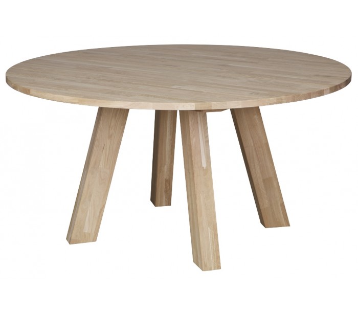 Spisebord i et moderne design, fremstillet i massivt ubehandlet egetræ, og bør efterbehandles med en klar lak eller voks. Bordet måler 75 cm i højden og 150 cm i diameter.