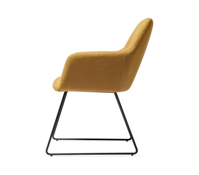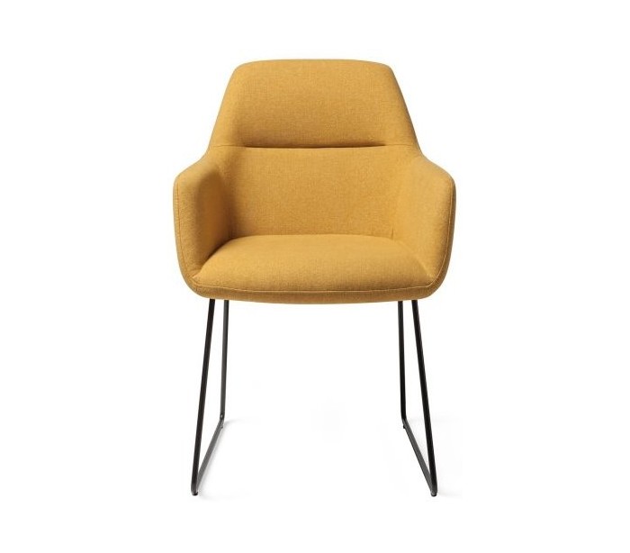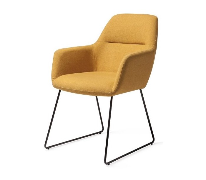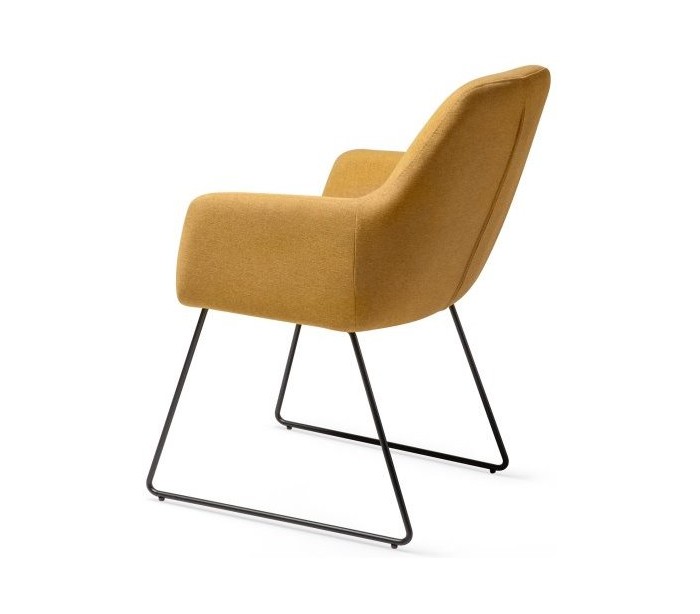 Sæt med 2 Kinko spisebordsstole i et moderne design, fremstillet med sæde i sennepsgul polyester og stel i sortlakeret metal. Stolen måler 84 cm i højden over ryggen og med siddehøjde på 48 cm.