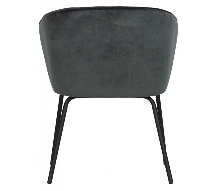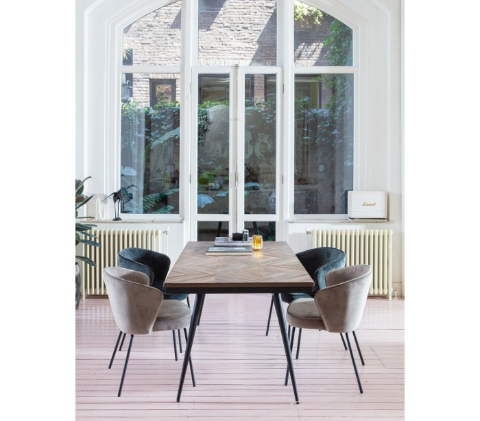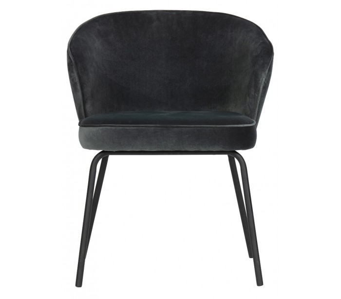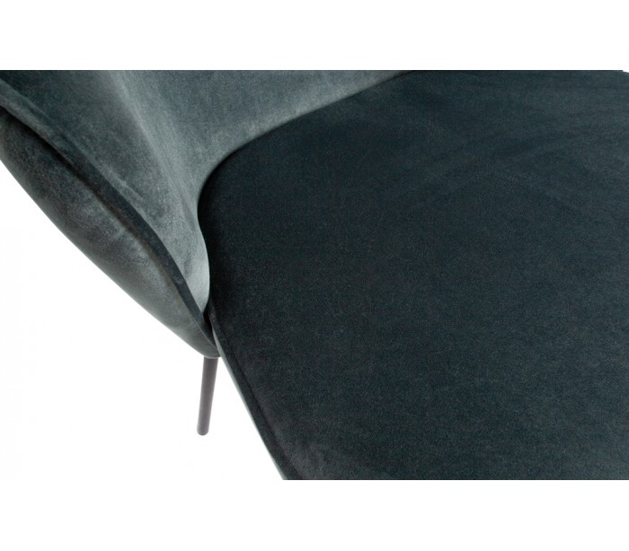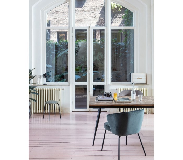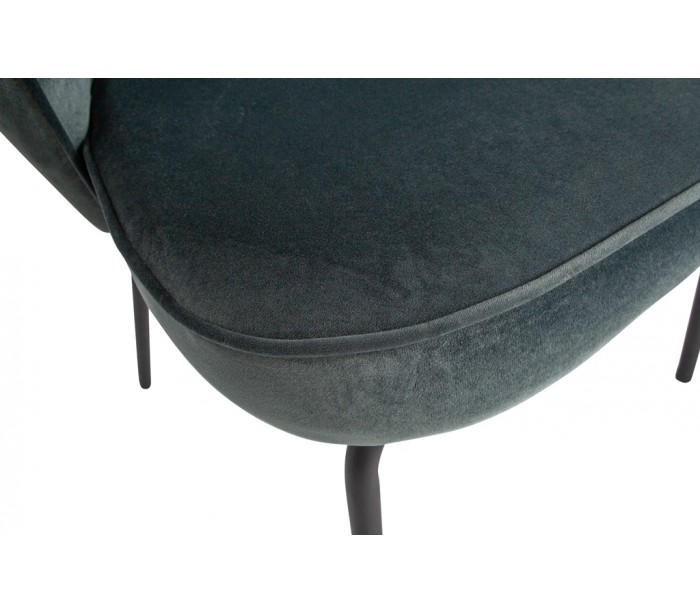 Sæt med 2 spisebordsstole udført i et flot design af stålblå velour og med ben i sortlakeret metal. Stolene måler 77 cm i højden og er polstret med højkvalitets skum.