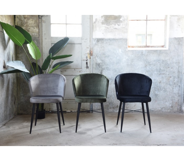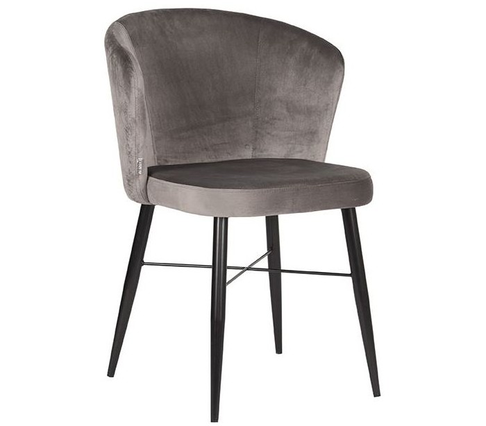 Spisebordsstol udført i et design af grå velour og stel i sortlakeret metal. Stolen måler 58 cm i bredden og 85 cm i højden over ryggen og er polstret med højkvalitets skum.