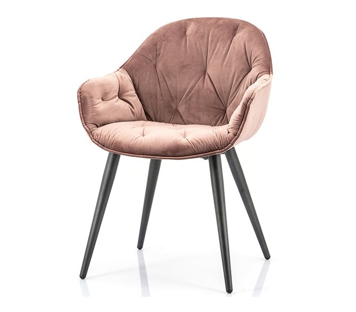 Spisebordsstol i et moderne design, fremstillet i velour og med ben i sortlakeret metal. Stolen måler 82 cm i højden og 58 cm i bredden.