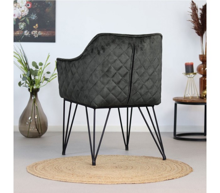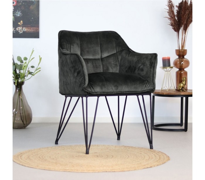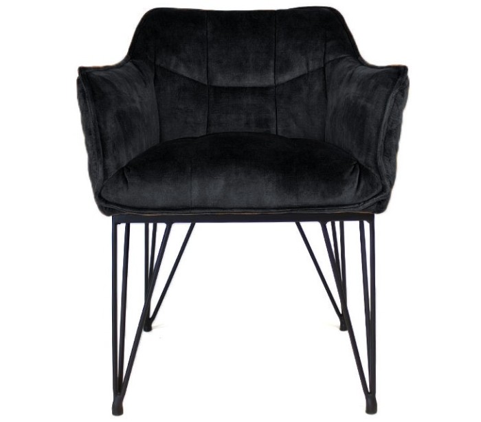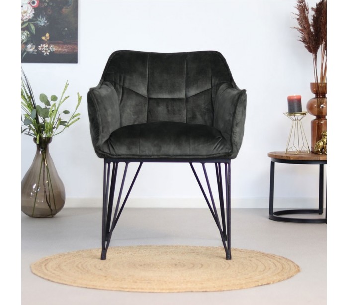 Jayron spisebordsstol i et moderne design, fremstillet med sæde i antracitfarvet velour og ben i sortlakeret metal. Stolen måler 81 cm i højden over ryggen og med siddehøjde på 54 cm. Velouren er vandafvisende og med martindale 100.000, som gør stolen særligt anvendelig til restaurationer/spisesteder.