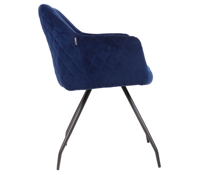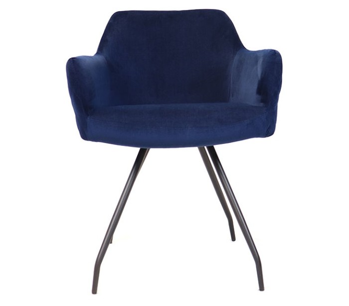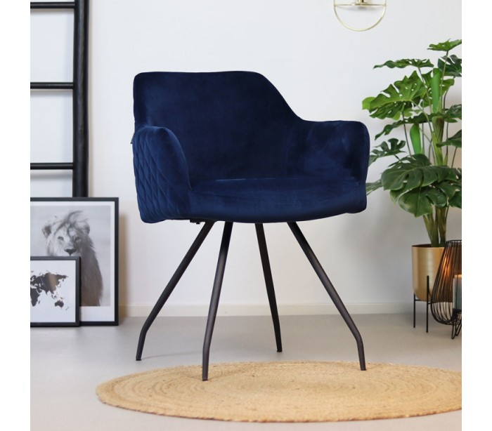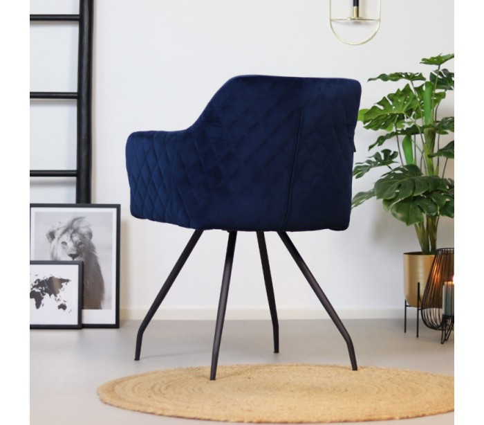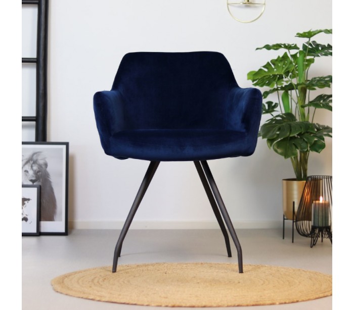 Nelly spisebordsstol i et moderne design, fremstillet med sæde i mørkeblå velour og ben i sortlakeret metal. Stolen måler 81,5 cm i højden over ryggen og med siddehøjde på 50 cm. Velouren er vandafvisende og med martindale 70.000, som gør stolen særligt anvendelig til restaurationer/spisesteder.