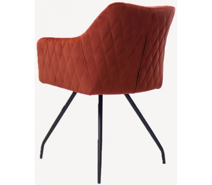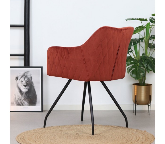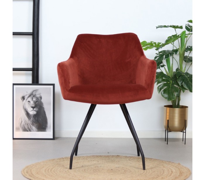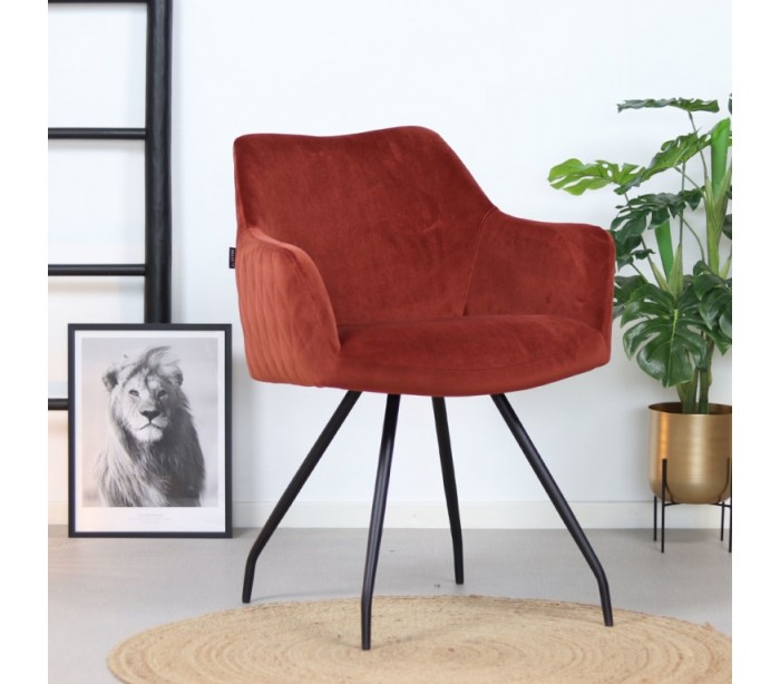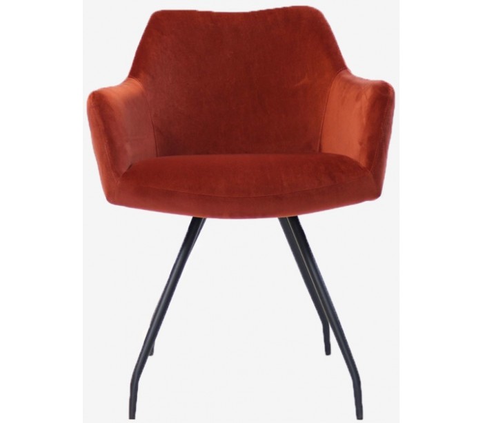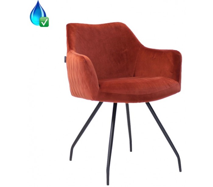 Nelly spisebordsstol i et moderne design, fremstillet med sæde i kobberfarvet velour og ben i sortlakeret metal. Stolen måler 81,5 cm i højden over ryggen og med siddehøjde på 50 cm. Velouren er vandafvisende og med martindale 70.000, som gør stolen særligt anvendelig til restaurationer/spisesteder.