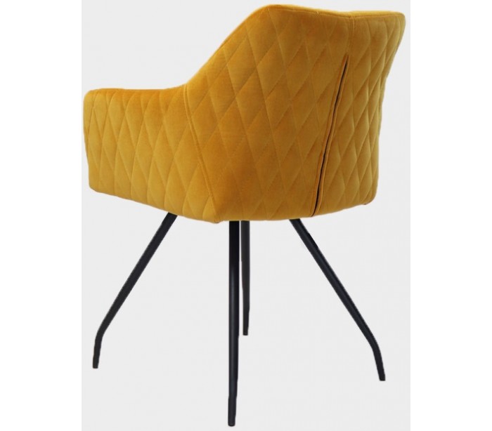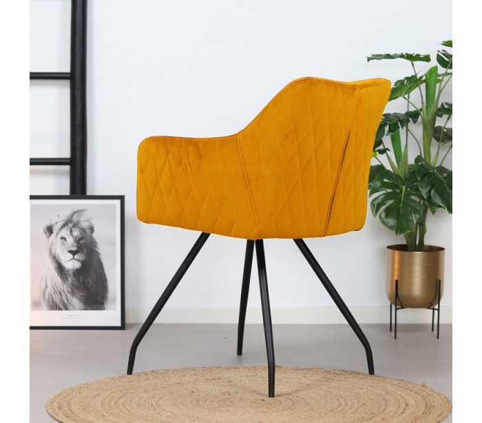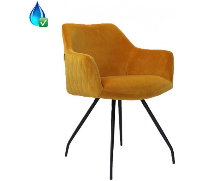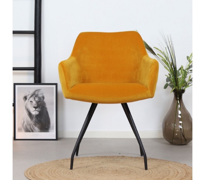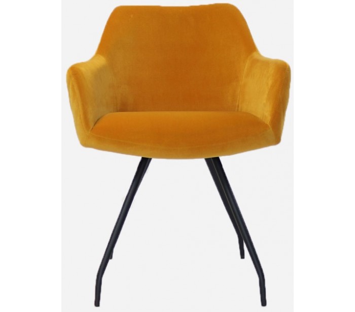 Nelly spisebordsstol i et moderne design, fremstillet med sæde i okkerfarvet velour og ben i sortlakeret metal. Stolen måler 81,5 cm i højden over ryggen og med siddehøjde på 50 cm. Velouren er vandafvisende og med martindale 70.000, som gør stolen særligt anvendelig til restaurationer/spisesteder.