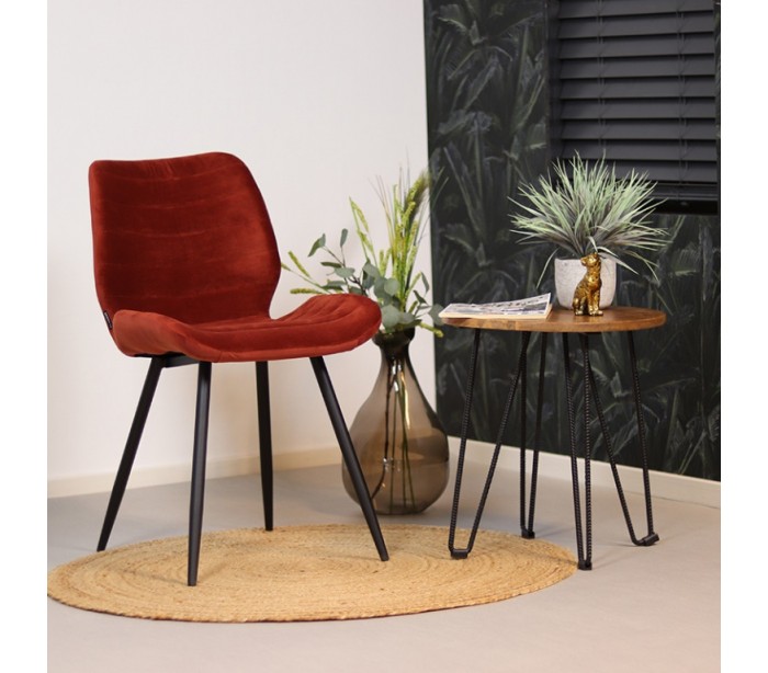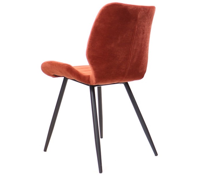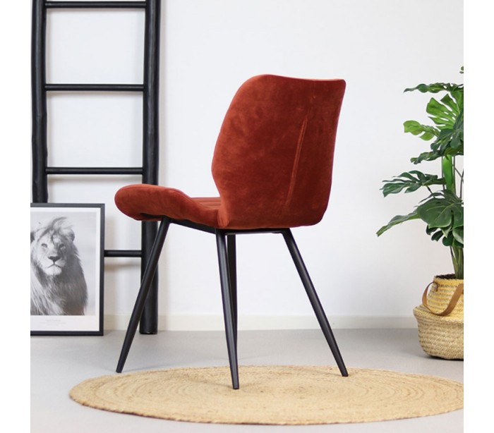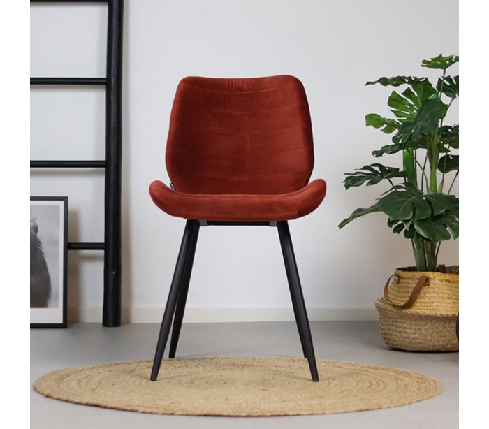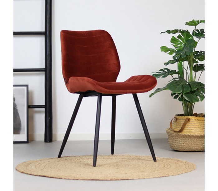 Toby spisebordsstol i et moderne design, fremstillet med sæde i kobberfarvet velour og ben i sortlakeret metal. Stolen måler 77 cm i højden over ryggen og med siddehøjde på 48 cm. Betrækket er med martindale 70.000 og er vandafvisende, som gør stolen særligt anvendelig til restaurationer/spisesteder.