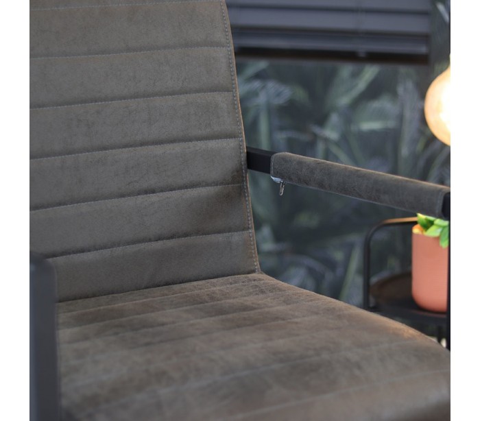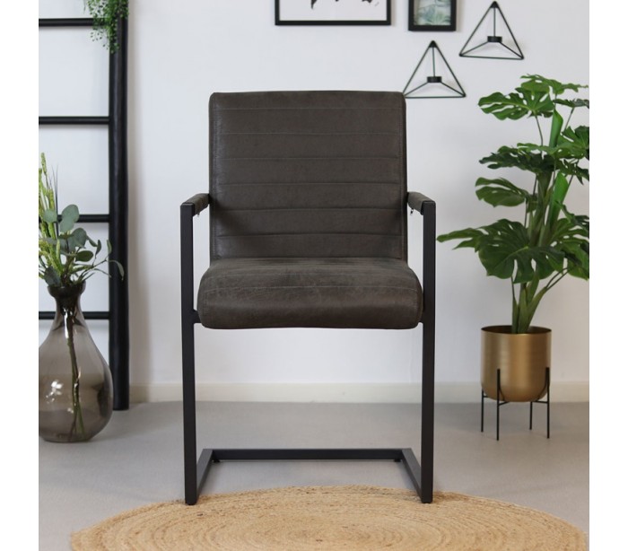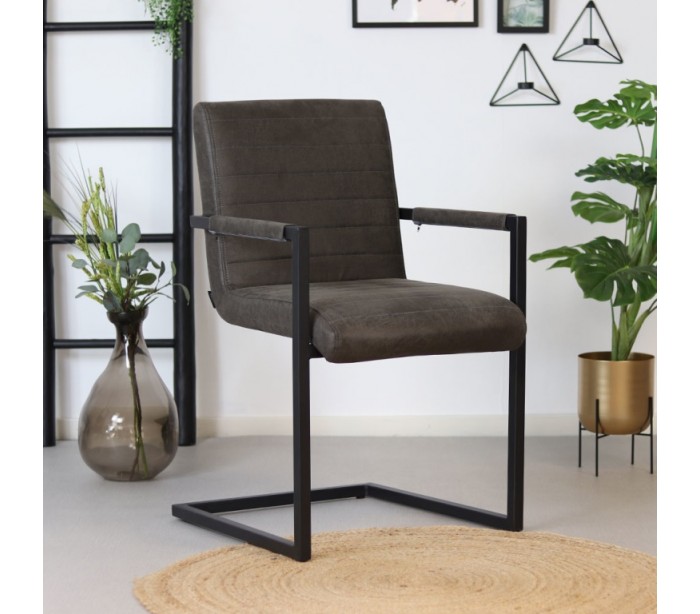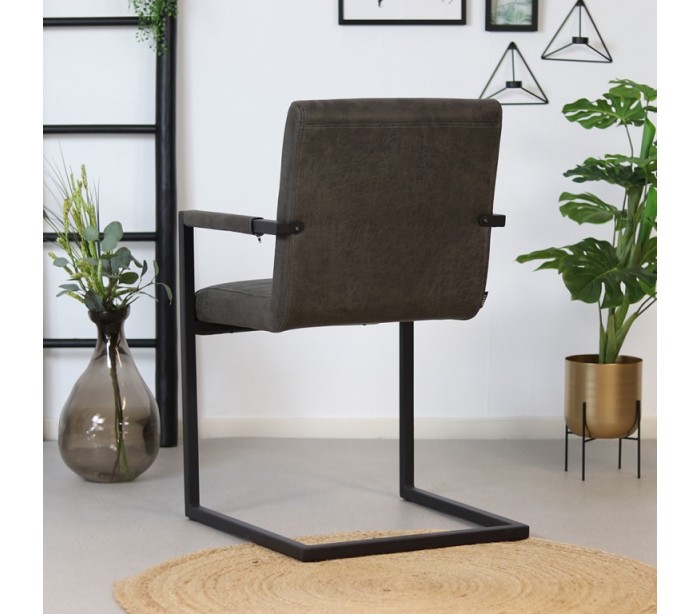 Block spisebordsstol i et industrielt design, fremstillet med sæde i øko-læder (30% Polyester/70% Læder) og stel i sortlakeret metal. Stolen måler 86 cm i højden over ryggen og med siddehøjde på 50 cm. Betrækket er vandafvisende.