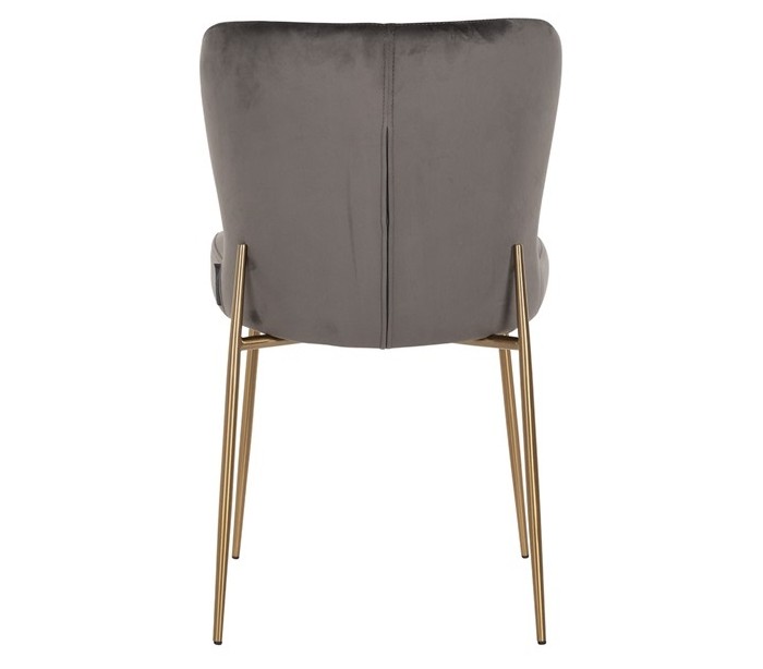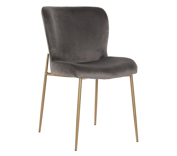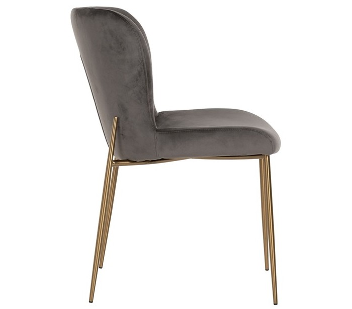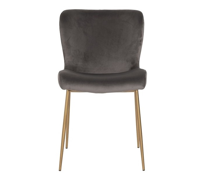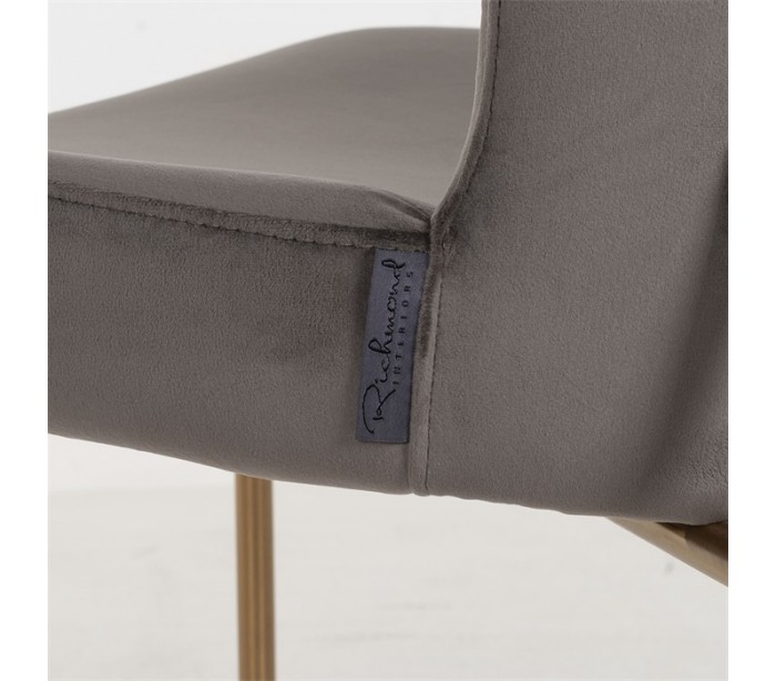 Spisebordsstol i et design fra hollandske Richmond Interiors. Stolen er fremstillet i stengrå velour og med ben i børstet guldfarvet stål. Stolen måler 84,5 cm i højden over ryggen og 50 x 63 cm i bredde og dybde.
