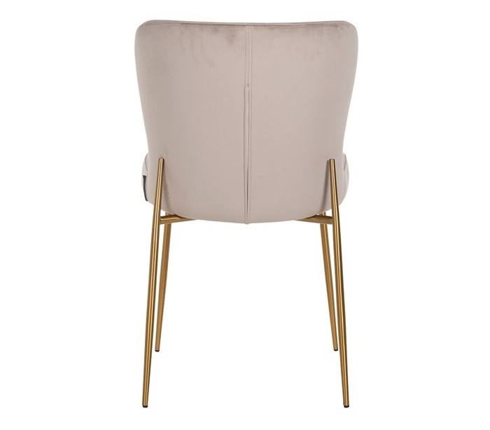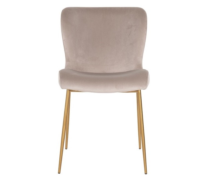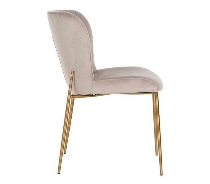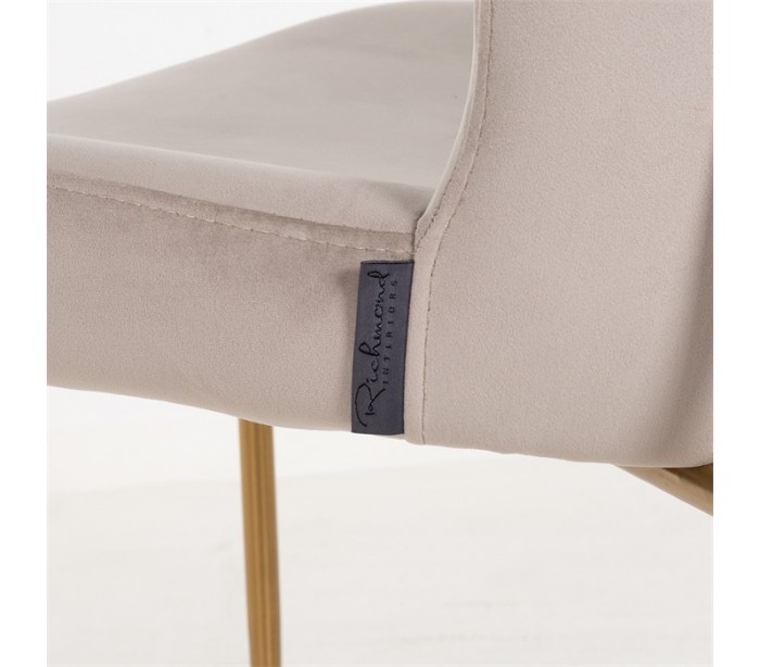 Spisebordsstol i et design fra hollandske Richmond Interiors. Stolen er fremstillet i khakifarvet velour og med ben i børstet guldfarvet stål. Stolen måler 84,5 cm i højden over ryggen og 50 x 63 cm i bredde og dybde.
