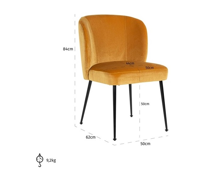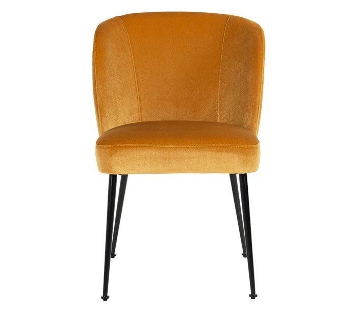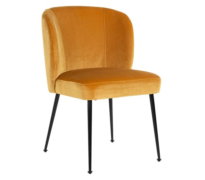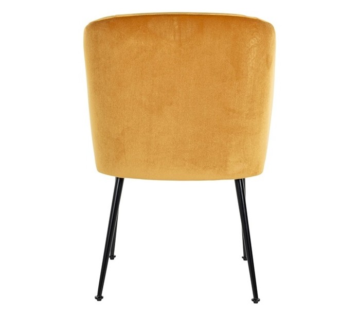 Spisebordsstol i et design fra hollandske Richmond Interiors. Stolen er fremstillet i guldfarvet velour og med ben i sortlakeret stål. Stolen måler 84 cm i højden over ryggen og 57 x 62 cm i bredde og dybde.