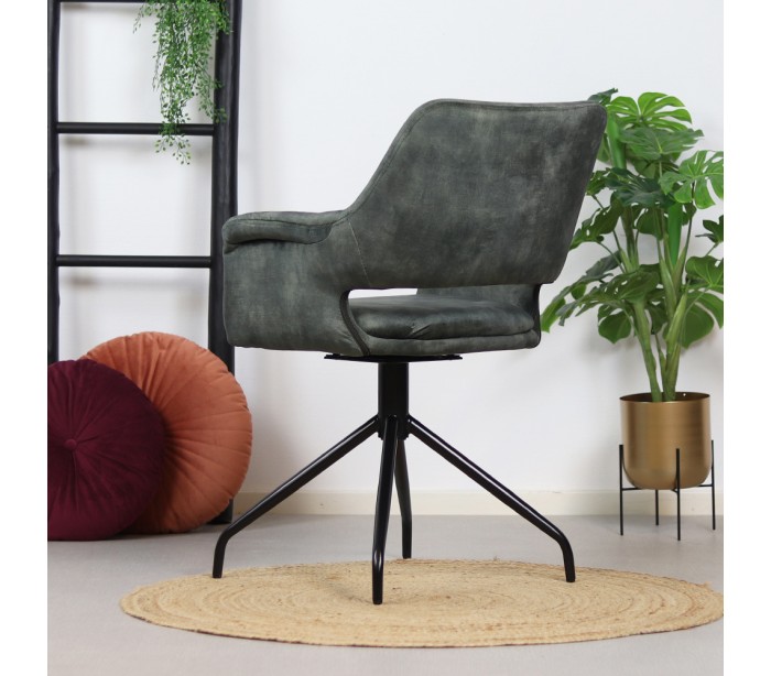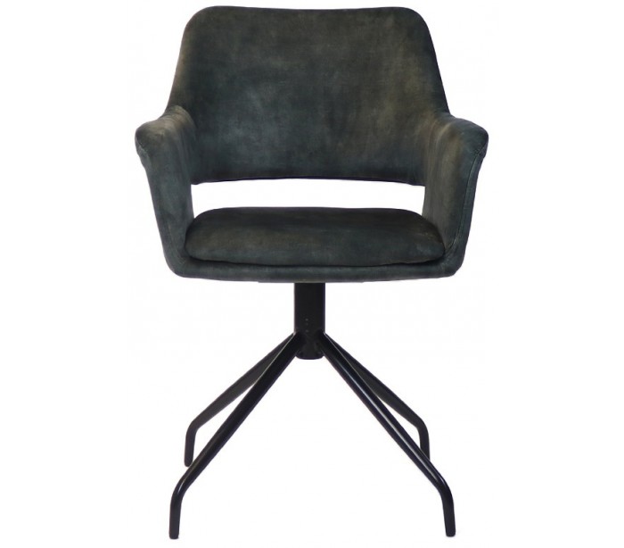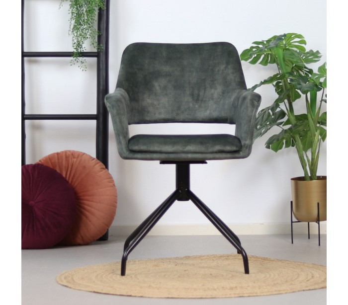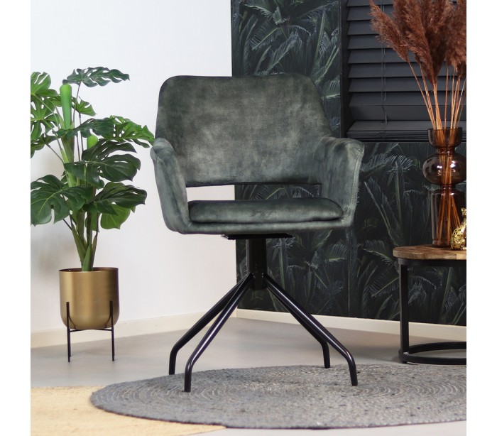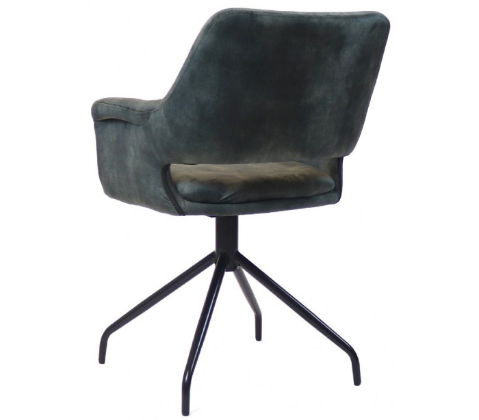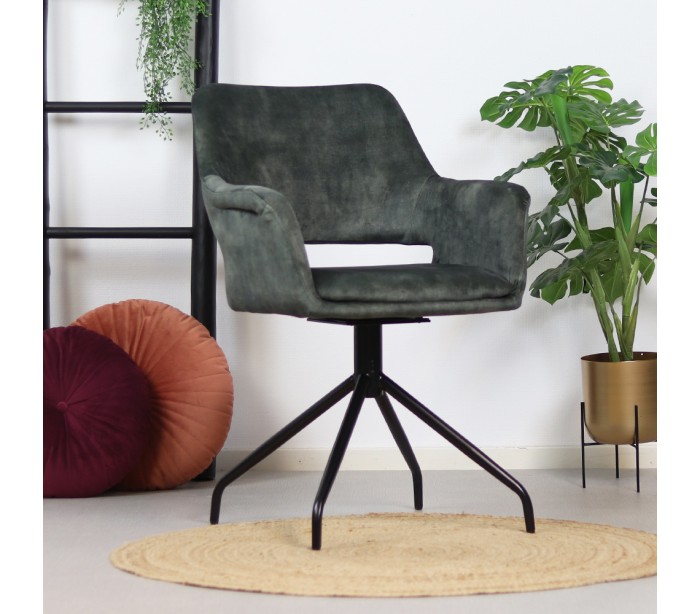 Nina spisebordsstol i et moderne design, fremstillet med sæde i mørkegrøn velour og ben i sortlakeret metal. Stolen måler 84 cm i højden over ryggen og med siddehøjde på 48 cm. Velouren er vandafvisende og med martindale 80.000, som gør stolen særligt anvendelig til restaurationer/spisesteder. Stellet er rotérbart 180 grader.