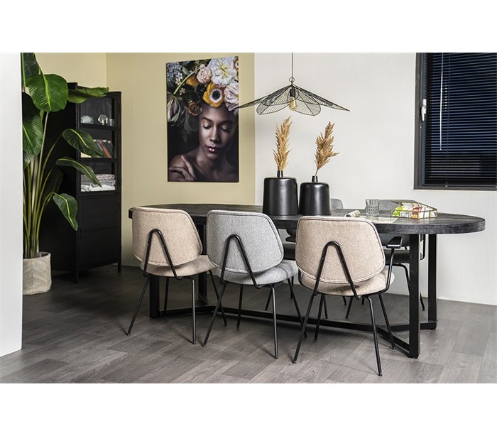 Spisebordsstol med armlæn, fremstillet i et design med stel i sortlakeret metal og sæde samt ryg i polyester. En komfortabel spisebordsstol der vil passe ind i både den moderne, såvel som i den klassiske indretning. Stolen måler 82 cm over ryggen.