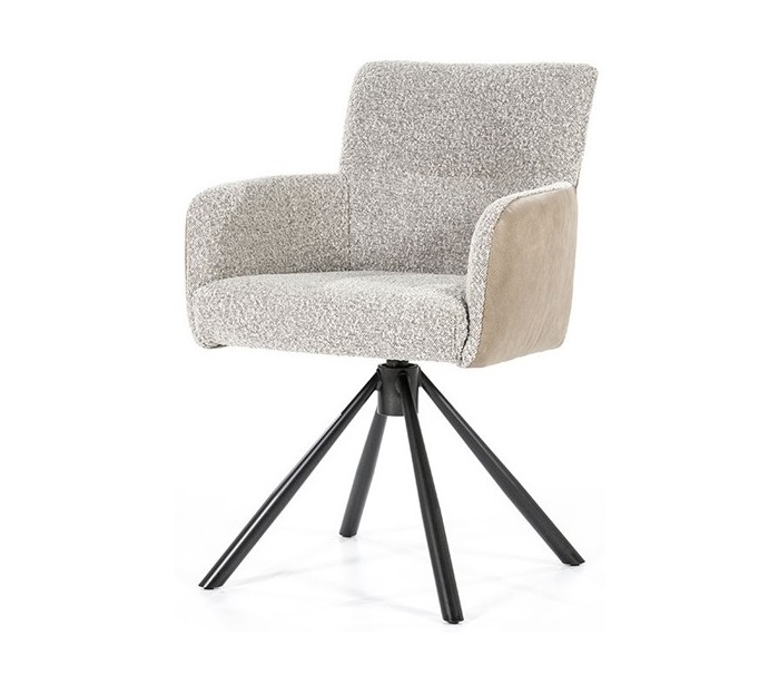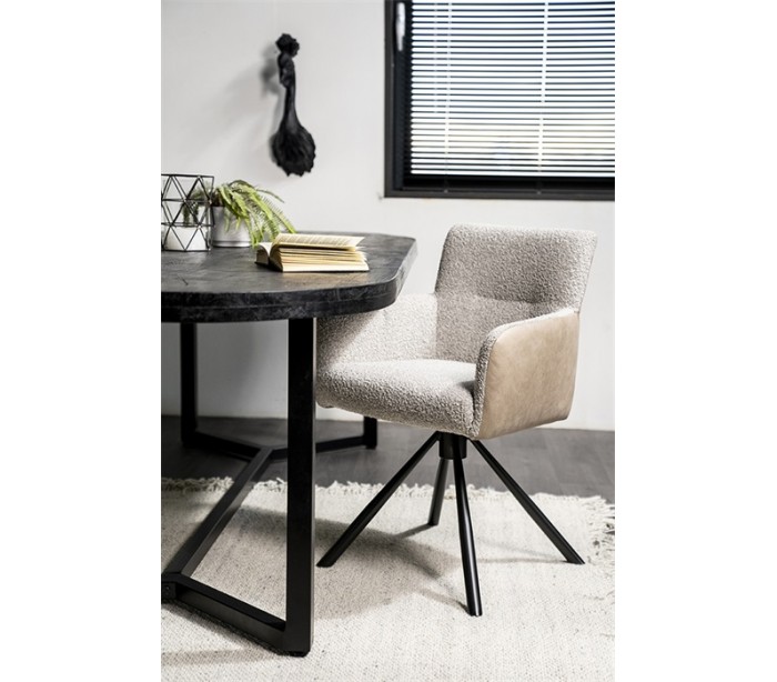Spisebordsstol med rotérbart stel og med armlæn, fremstillet i et design af sortlakeret metal og sæde i polyester og ægte læder. En komfortabel spisebordsstol der vil passe ind i både den moderne, såvel som i den klassiske indretning. Stolen måler 86 cm over ryggen.