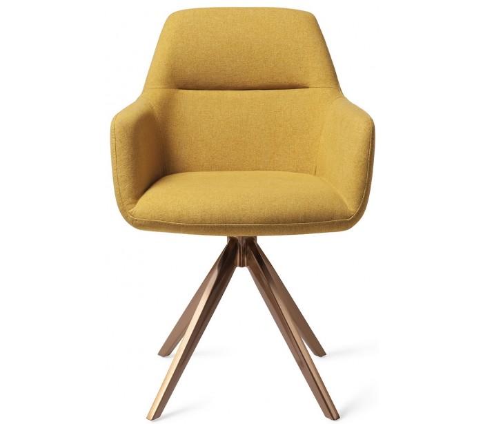 Sæt med 2 Kinko spisebordsstole i et moderne design, fremstillet med sæde i sennepsgul polyester og stel i rødguldfarvet metal. Stolen måler 84 cm i højden over ryggen og med siddehøjde på 48 cm. Stellet er rotérbart.