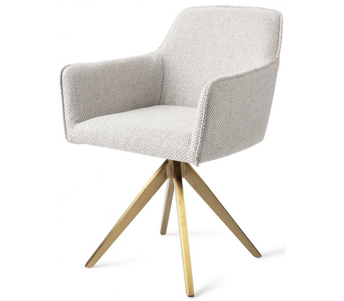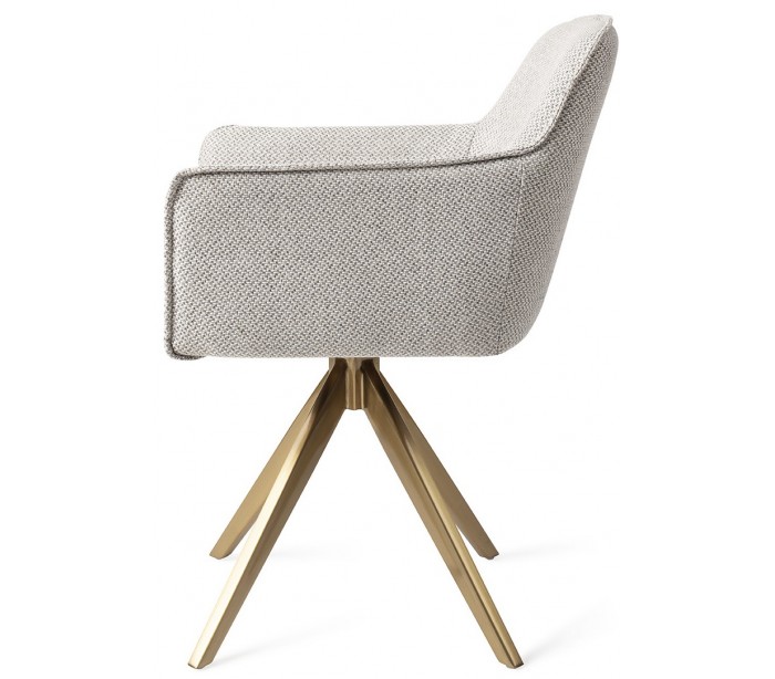 Sæt med 2 Hofu spisebordsstole i et moderne design, fremstillet med sæde i gråmeleret polyester og stel i guldfarvet metal. Stolen måler 82 cm i højden over ryggen og med siddehøjde på 48,5 cm. Stellet er rotérbart.
