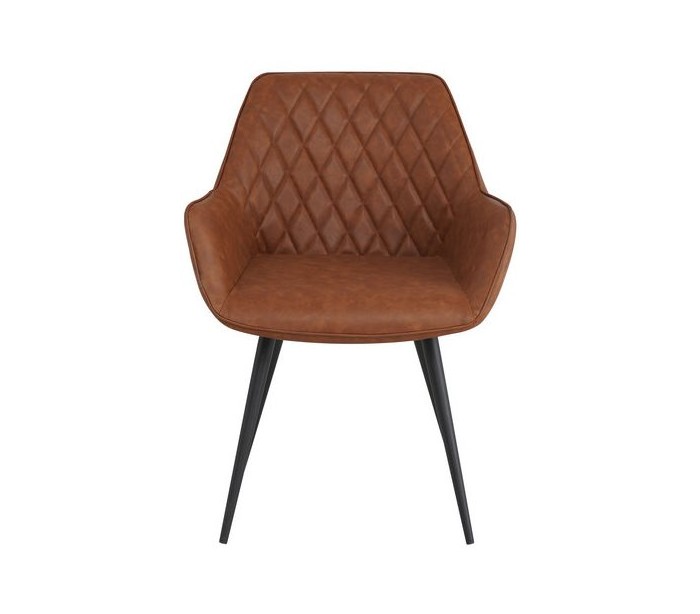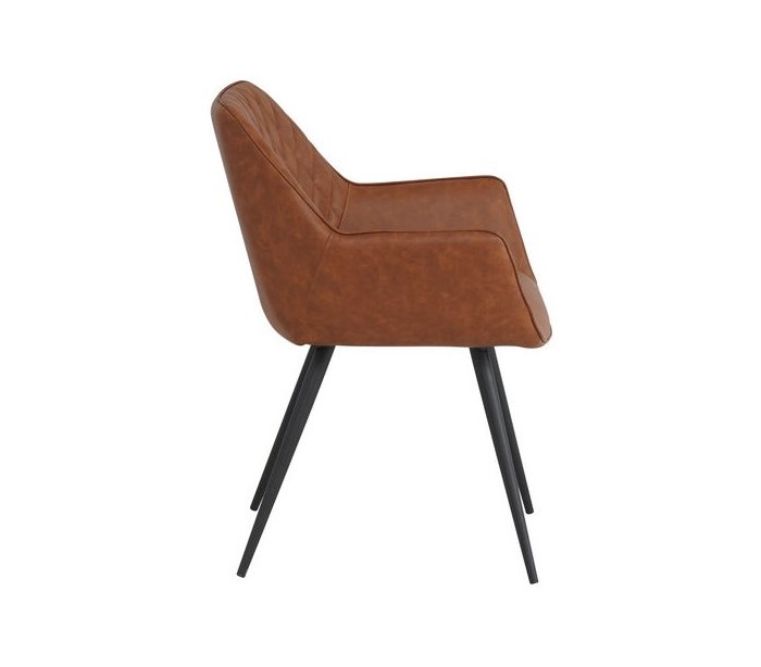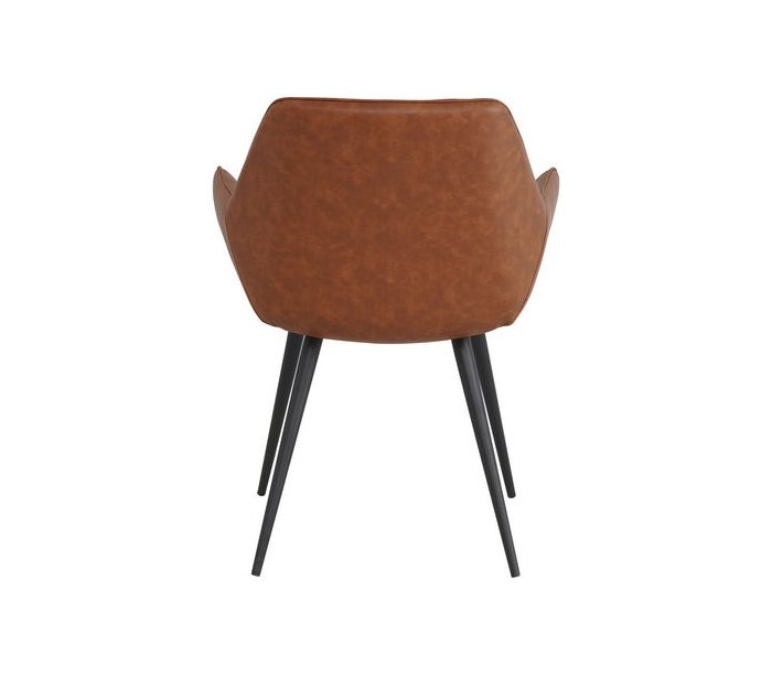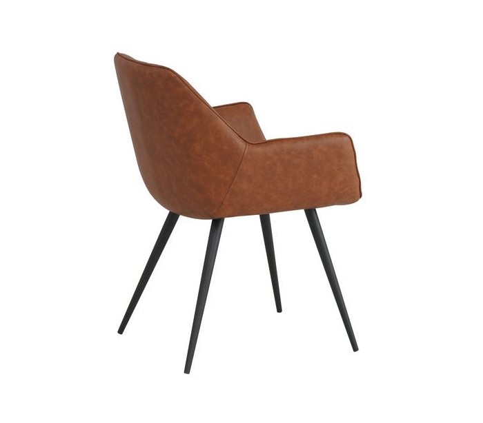 Sæt med 2 spisebordsstole i et industrielt design, fremstillet med sæde i cognacfarvet PU-læder og stel i sortlakeret metal. Stolene måler 83 cm i højden over ryggen og med siddehøjde på 49 cm.
