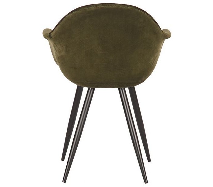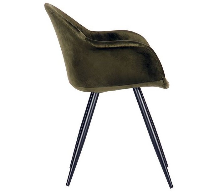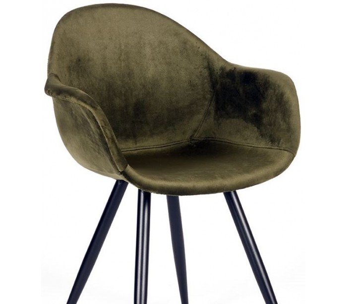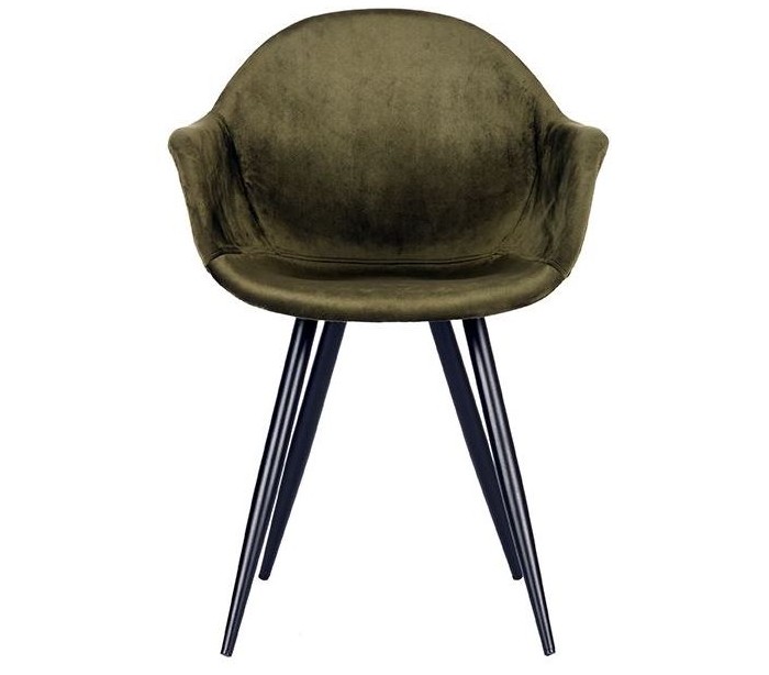 Forli spisebordsstol udført i et design, fremstillet i armygrøn velour og med ben i sortlakeret metal. Stolen måler 83 cm i højden og med siddehøjde på 48 cm.