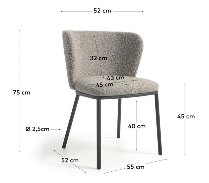 Sæt med 2 Ciselia spisebordsstole, udført i et moderne design af sortlakeret metal og lysegrå shearling polyester. Stolene måler 75 cm i højden over ryggen, og med en siddehøjde på 45 cm.